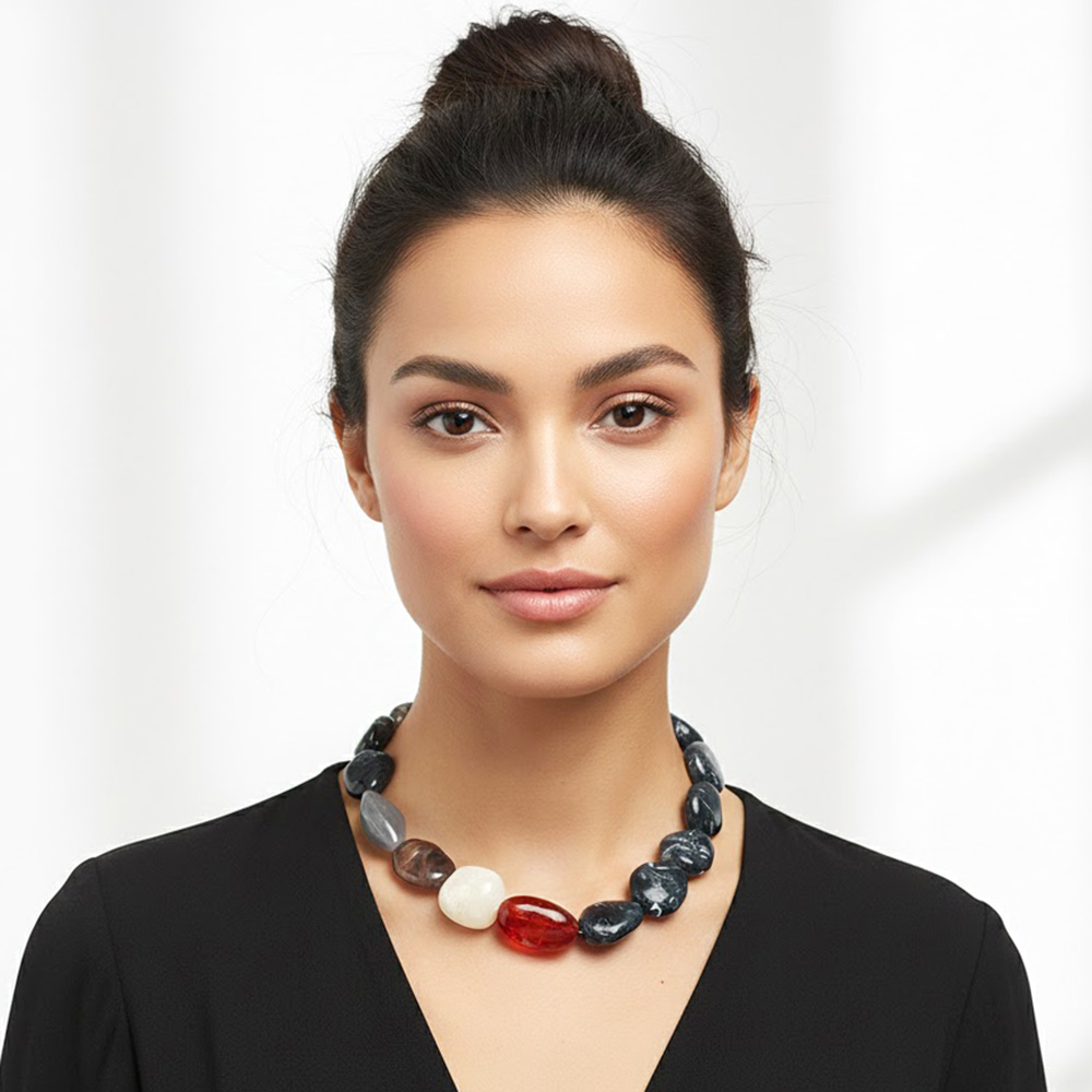 Details • Necklace Size : 17" + 3.5" L • Decor Size : 1" L • Bold nugget bead statement necklace featuring large irregular-shaped beads with a smooth polished finish. Designed with an adjustable extender for a comfortable fit, this eye-catching accessory adds natural elegance and texture to everyday looks or elevated outfits. Perfect for gifting or styling. • Lead and Nickel Compliant