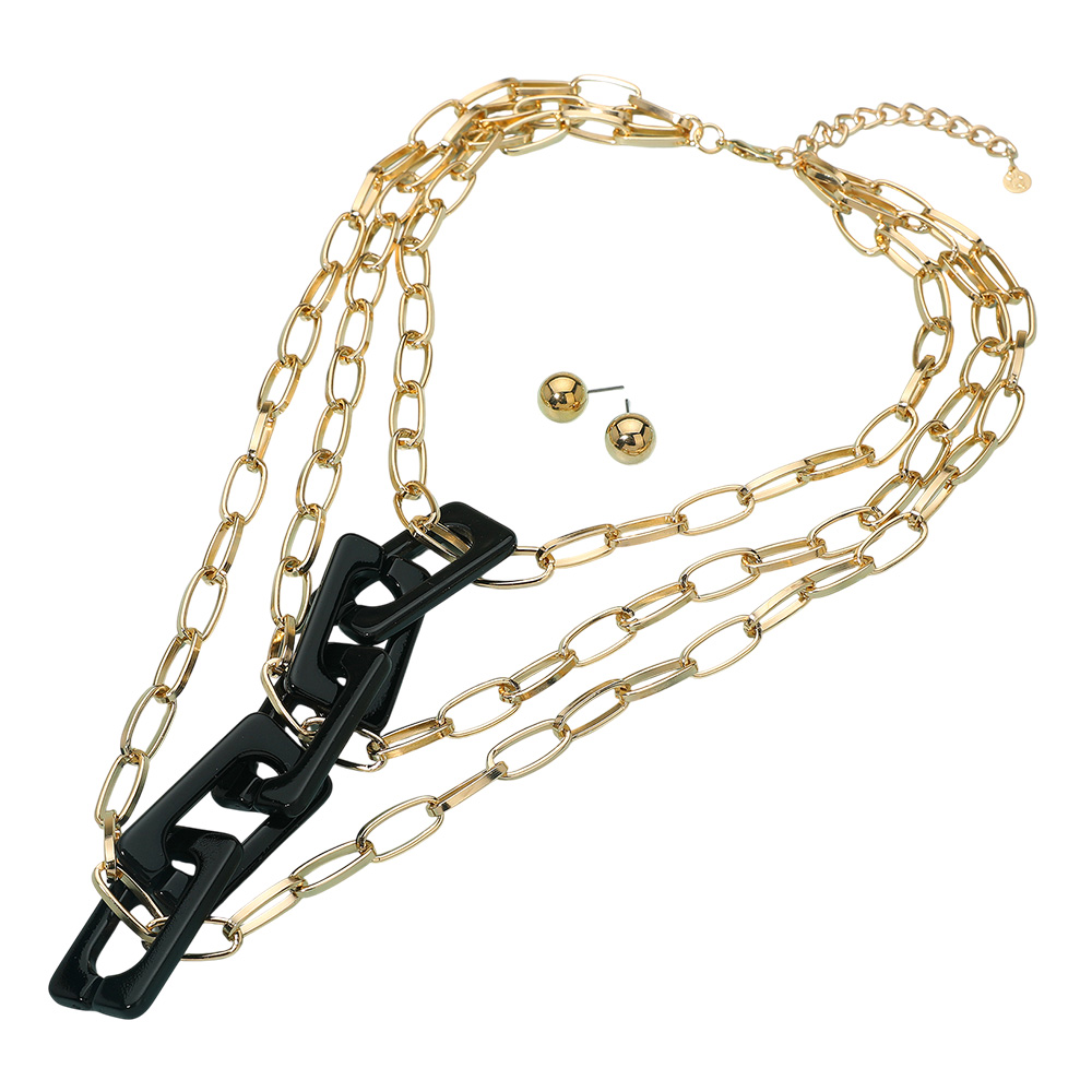 Details • Necklace Size : 18.5" + 4"L • Decor Size : 5" L • Earrings Size : 0.4" L • Bold layered chain necklace designed with oversized links and paired with matching stud earrings for a polished finish. Perfect for making a statement, this versatile jewelry set complements casual and dressy looks, adding modern edge and sophistication to your accessory collection. • Lead and Nickel Compliant