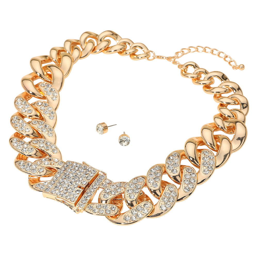 • This striking necklace and earring set showcases oversized linked detailing adorned with shimmering stones for a bold, glamorous look. Designed to elevate evening outfits and special occasions, it delivers eye-catching sparkle and a coordinated finish that enhances any standout style.