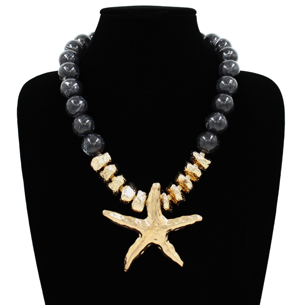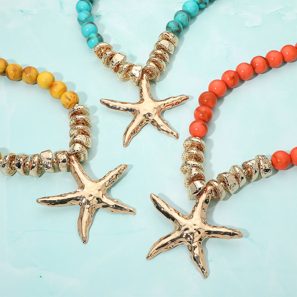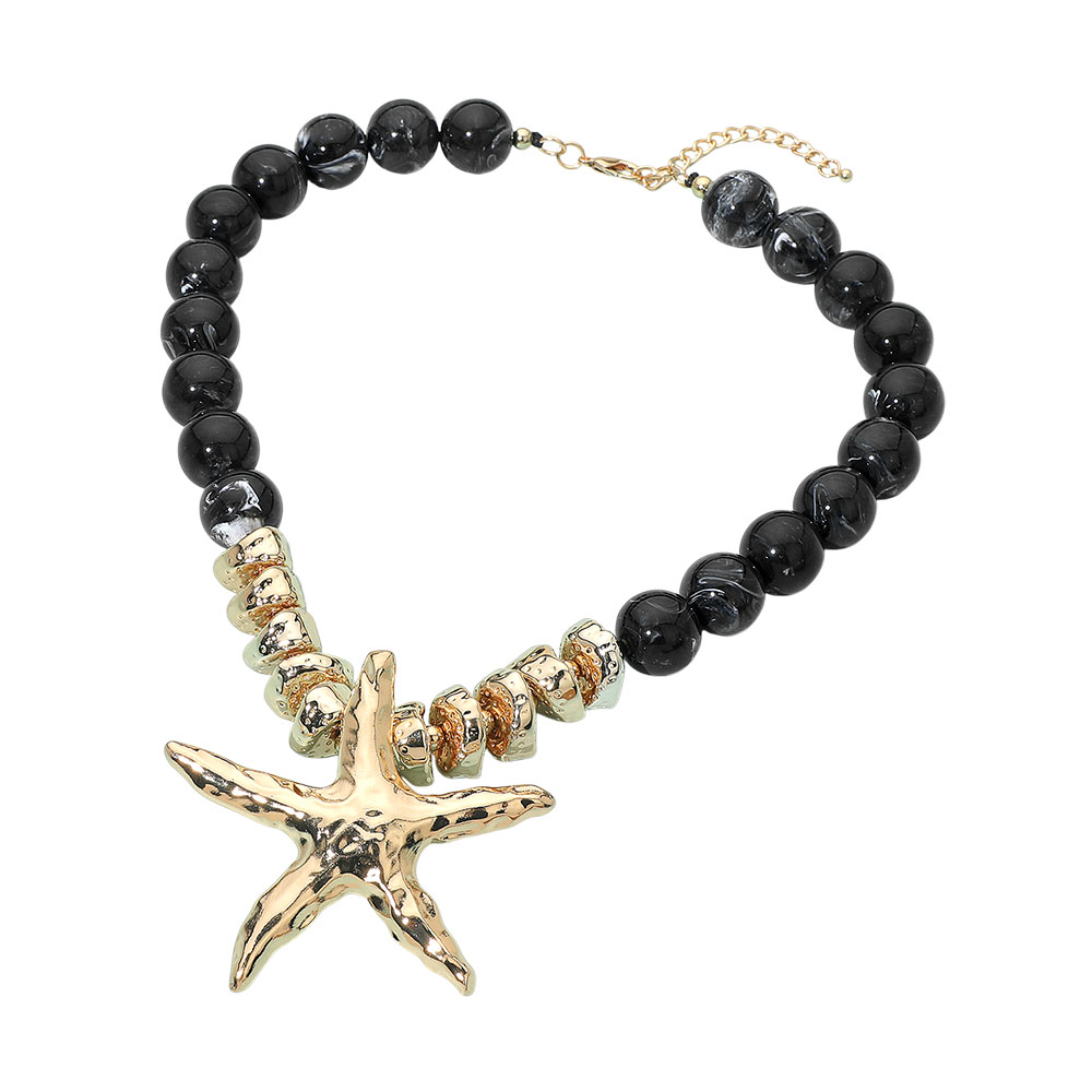 Details • Necklace Size : 22" + 3" L • Pendant Size : 3.25" X 3" • Bold beaded necklace featuring a sculpted starfish pendant and textured spacer accents for a coastal-inspired statement look. Perfect for vacations, beach outings, summer events or adding playful ocean-themed charm to everyday outfits with eye-catching style. • Lead and Nickel Compliant