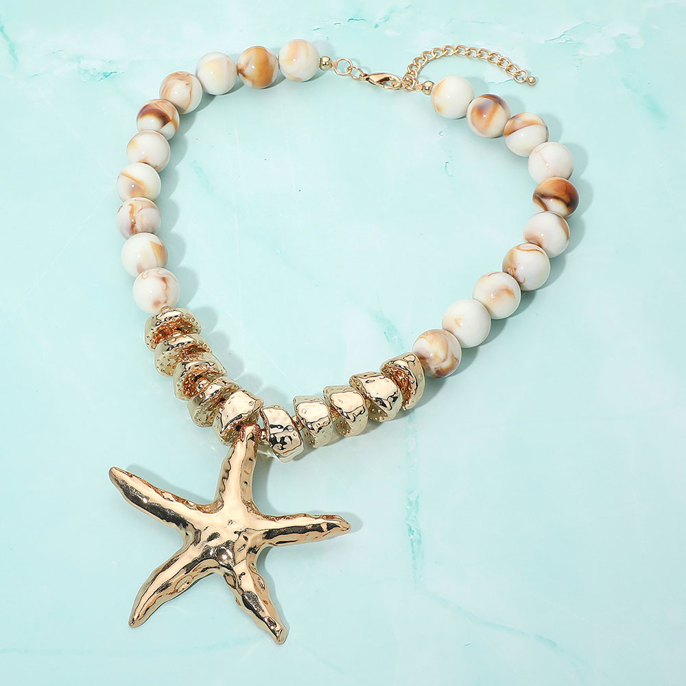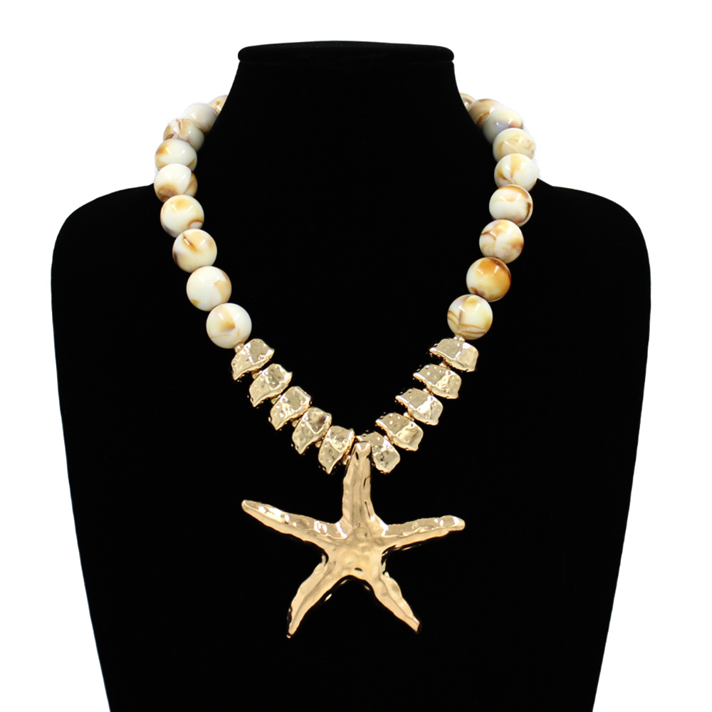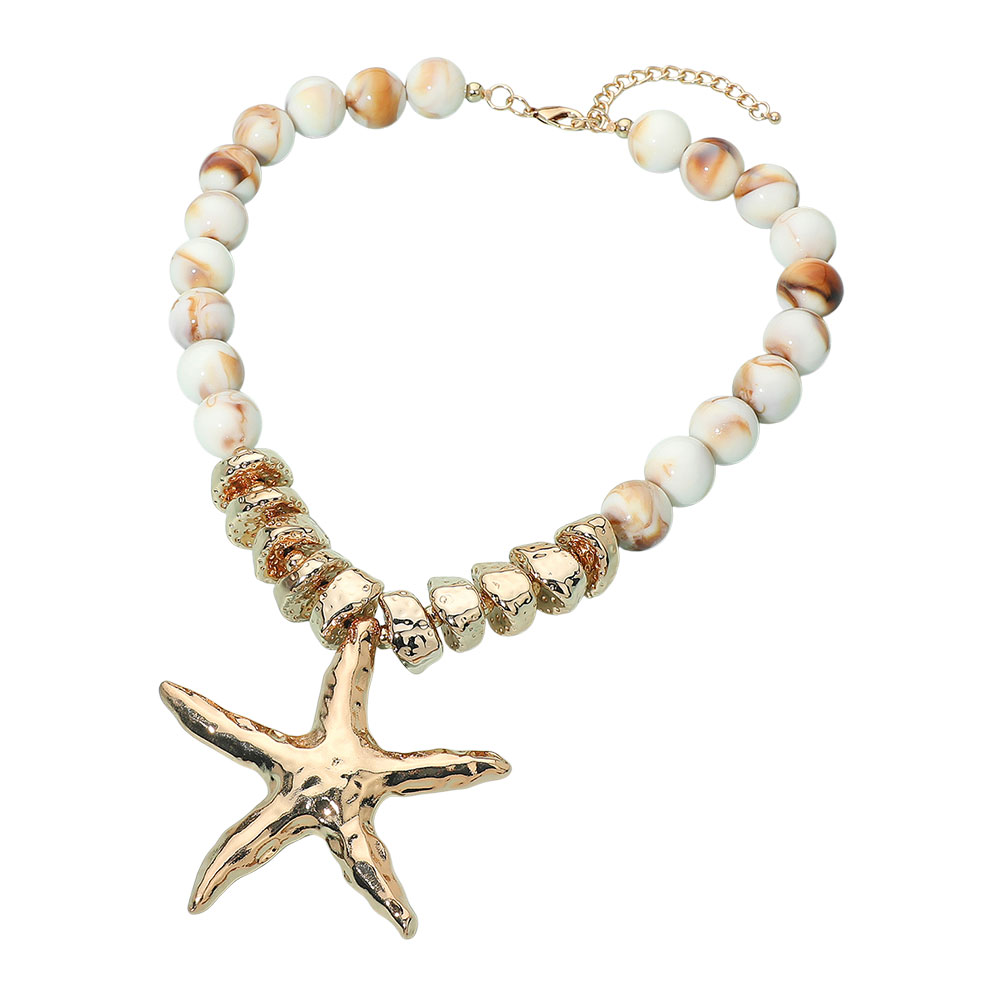 Details • Necklace Size : 22" + 3" L • Pendant Size : 3.25" X 3" • Bold beaded necklace featuring a sculpted starfish pendant and textured spacer accents for a coastal-inspired statement look. Perfect for vacations, beach outings, summer events or adding playful ocean-themed charm to everyday outfits with eye-catching style. • Lead and Nickel Compliant