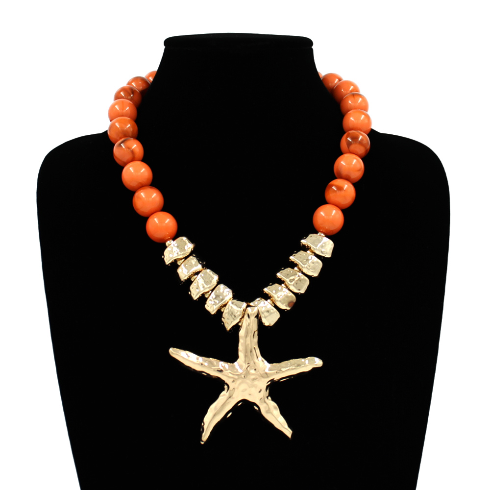 Details • Necklace Size : 22" + 3" L • Pendant Size : 3.25" X 3" • Bold beaded necklace featuring a sculpted starfish pendant and textured spacer accents for a coastal-inspired statement look. Perfect for vacations, beach outings, summer events or adding playful ocean-themed charm to everyday outfits with eye-catching style. • Lead and Nickel Compliant