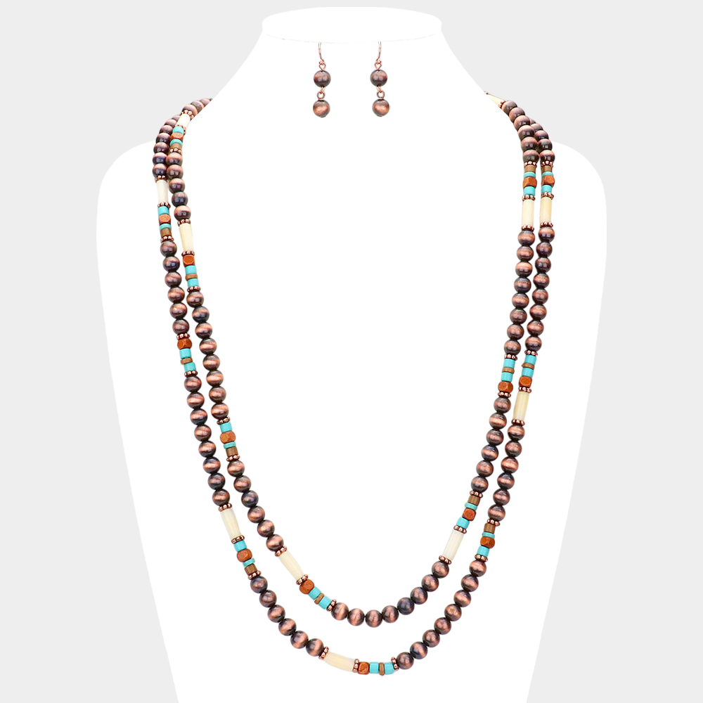 Burnished Metal Ball Wood Beaded Long Necklace
