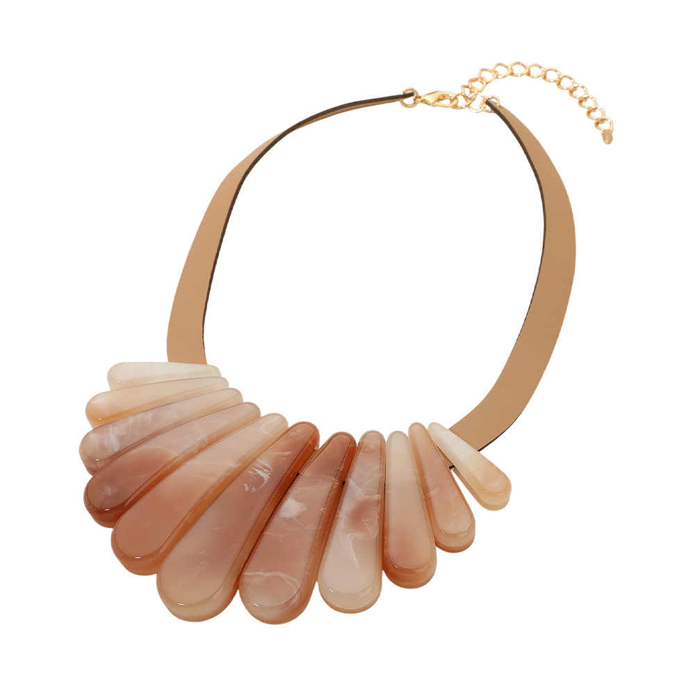 Details • Necklace Size : 19" + 3.5" L • Decor Size : 3" L • A striking statement necklace featuring sculptural fan-shaped resin pendants arranged in a graduated pattern. Bold and artistic, this unique piece elevates any outfit, making it the perfect accessory for standout style and modern elegance. • Lead and Nickel Compliant