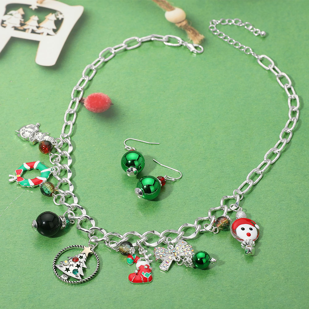 Details • Necklace Size : 18" + 3" L • Decor Size : 1.75" L • Earrings Size : 1.5" L • Playful holiday charm jewelry set featuring a statement necklace adorned with seasonal pendants and matching drop earrings. A cheerful and sparkling accessory perfect for holiday parties, gifting, and festive celebrations. • Lead and Nickel Compliant