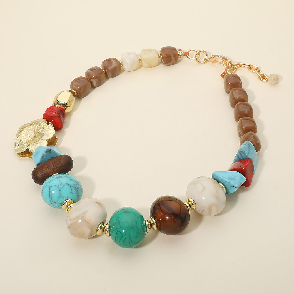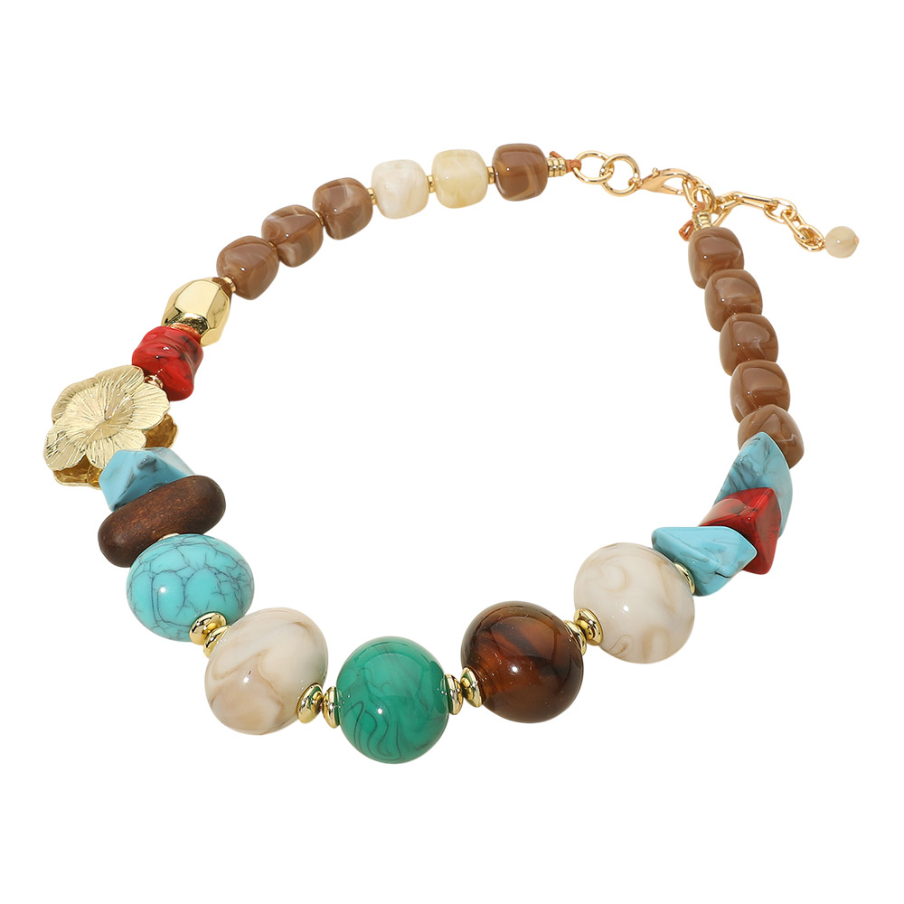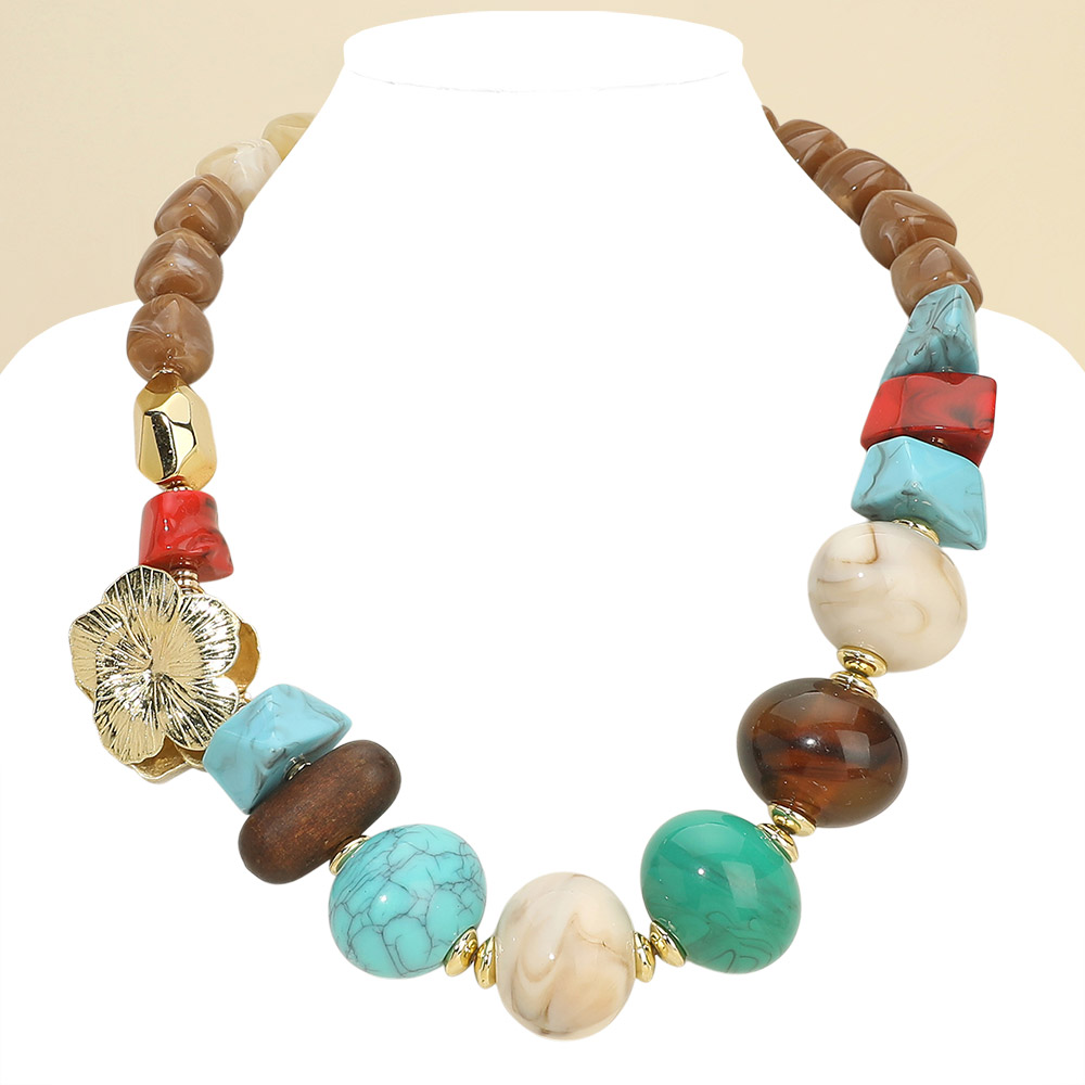 Details • Necklace Size : 23.5" + 2" L • Decor Size : 1.5" L • Bold statement necklace featuring a curated mix of bead shapes and sizes with an eye-catching floral accent detail. Designed to create instant impact, this piece adds dimension and artistic flair to any outfit. Ideal for boutiques seeking standout, fashion-forward jewelry that elevates everyday and special occasion styling. • Lead and Nickel Compliant