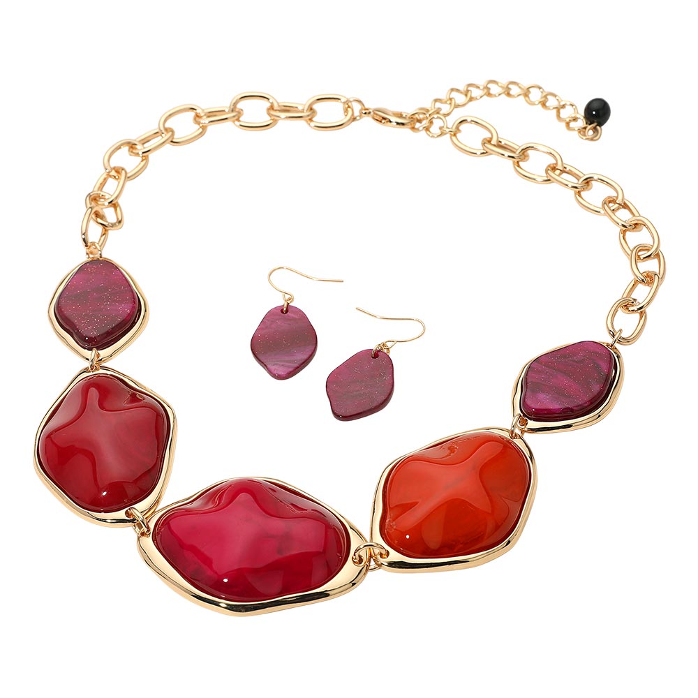 • This chunky gem statement necklace and earring set features an artistic organic design with sculpted, polished stones framed in elegant settings. Perfect for bold, confident style, it adds warmth and sophistication to any outfit, ideal for special occasions or evening wear.