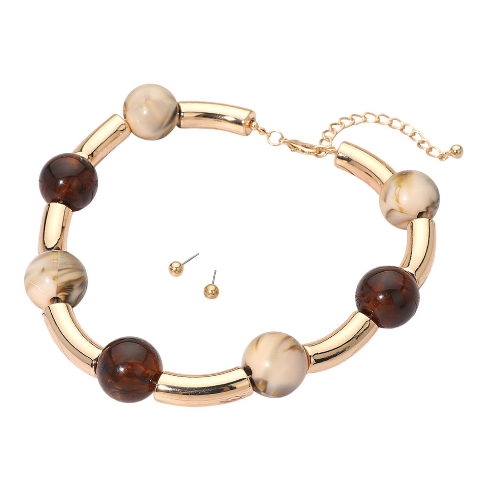 Details • Necklace Size : 17.5" + 4" L • Decor Size : 1" L • Earrings Size : 0.2" L • This Dual Tone Beaded Necklace and Stud Earring Set showcases a refined mix of smooth curved links and marbled beads for a balanced, elegant appeal. The coordinated design brings timeless sophistication, perfect for both daytime polish and evening glamour. Ideal for effortless styling. • Lead and Nickel Compliant