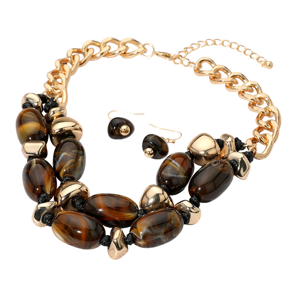 Details • Necklace Size : 18" + 3" L • Decor Size : 1.75" L • Earrings Size : 1.25" L • Bold chunky beaded necklace and earring set designed to make a statement with its striking design. Ideal for dressing up casual or evening outfits, this coordinated set adds drama and flair, making it a standout addition to any jewelry collection. • Lead and Nickel Compliant