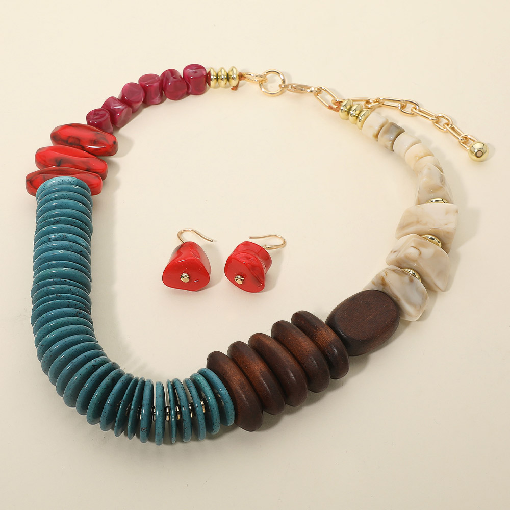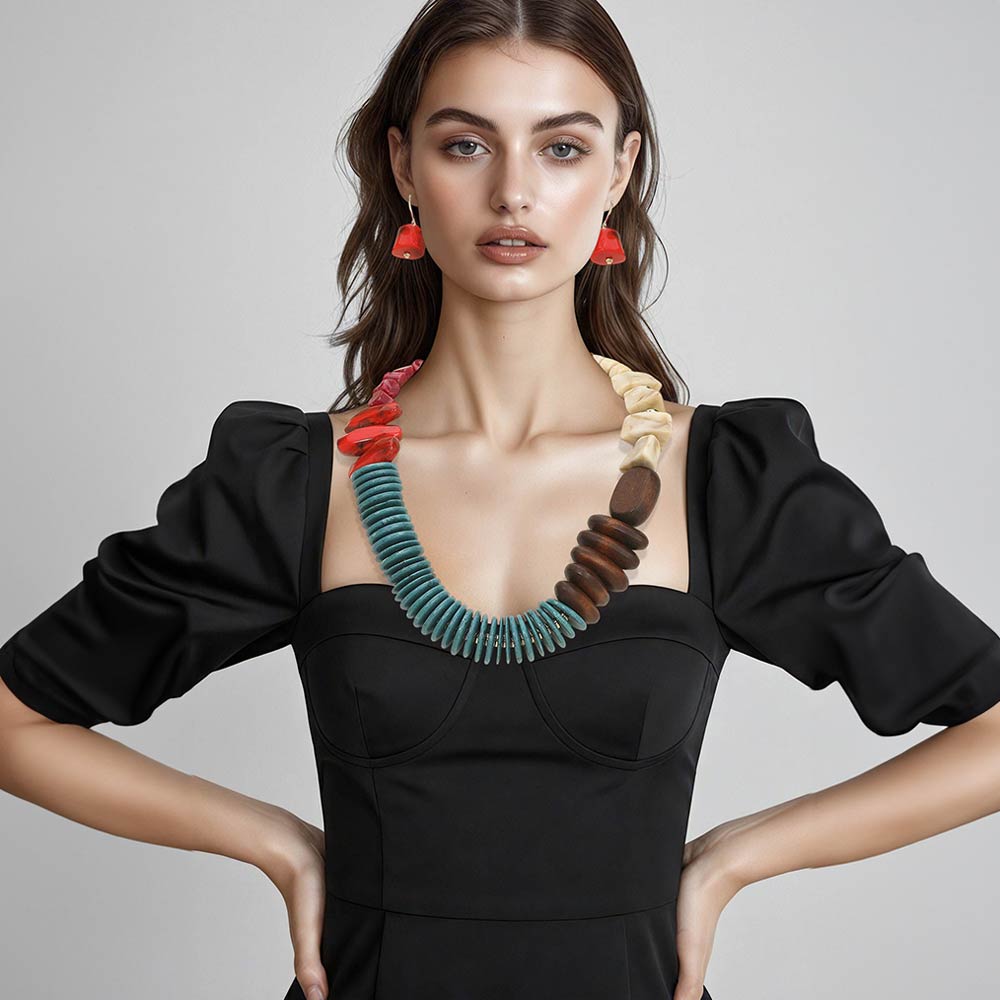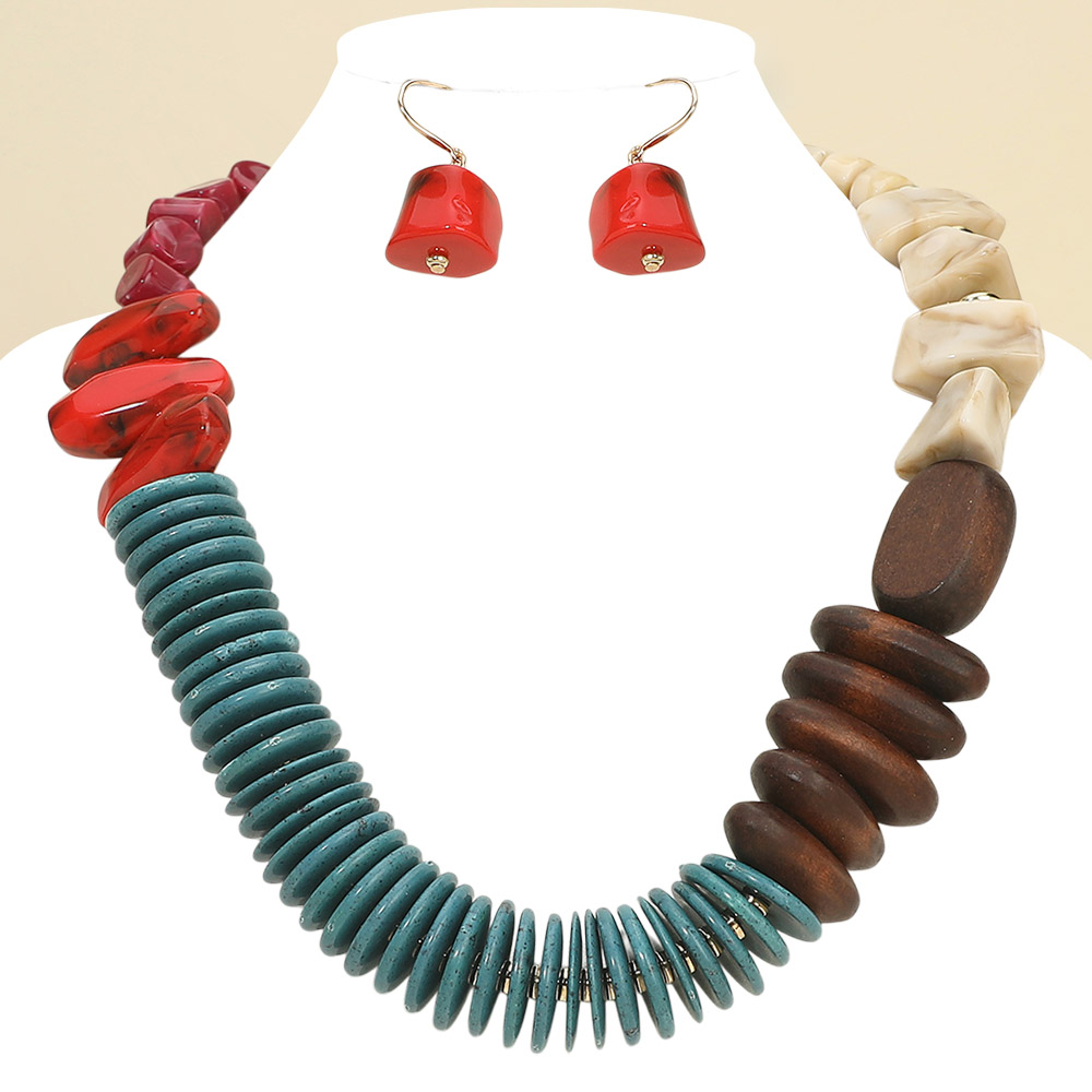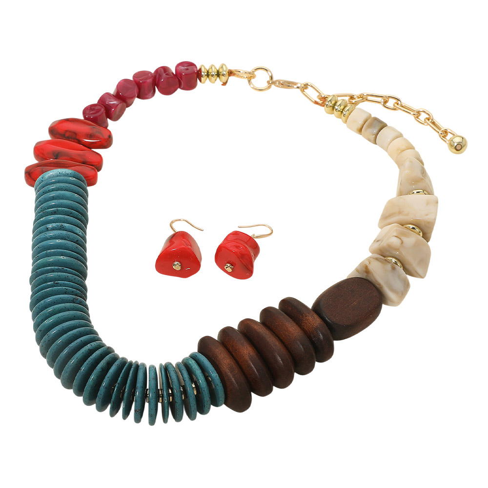 Details • Necklace Size : 22.5" + 3.5" L • Decor Size : 1.3" L • Earrings Size : 1.5" L • Statement necklace and matching earring set featuring bold, mixed bead shapes arranged in a balanced, eye-catching design. This coordinated set delivers a modern statement look that elevates casual outfits and resort-inspired styling. Ideal for boutiques seeking unique, fashion-forward jewelry sets that add texture, dimension, and visual impact to curated accessory collections. • Lead and Nickel Compliant