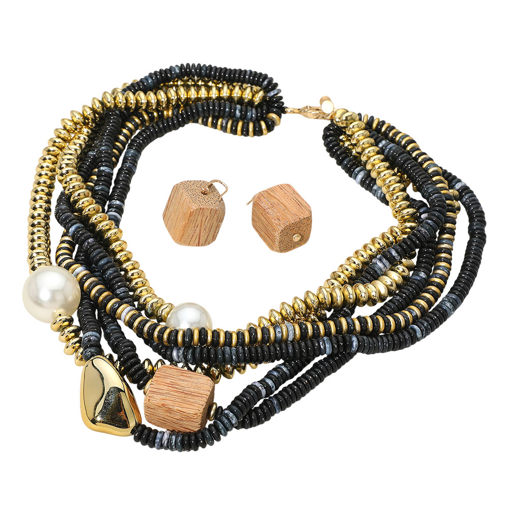 Chunky Pearl Wooden Cube Metal Pebble Accent Multi Disc Beaded Layered Toggle Statement Necklace Chunky Pearl Wooden Cube Metal Pebble Accent Multi Disc Beaded Layered Toggle Statement Necklace