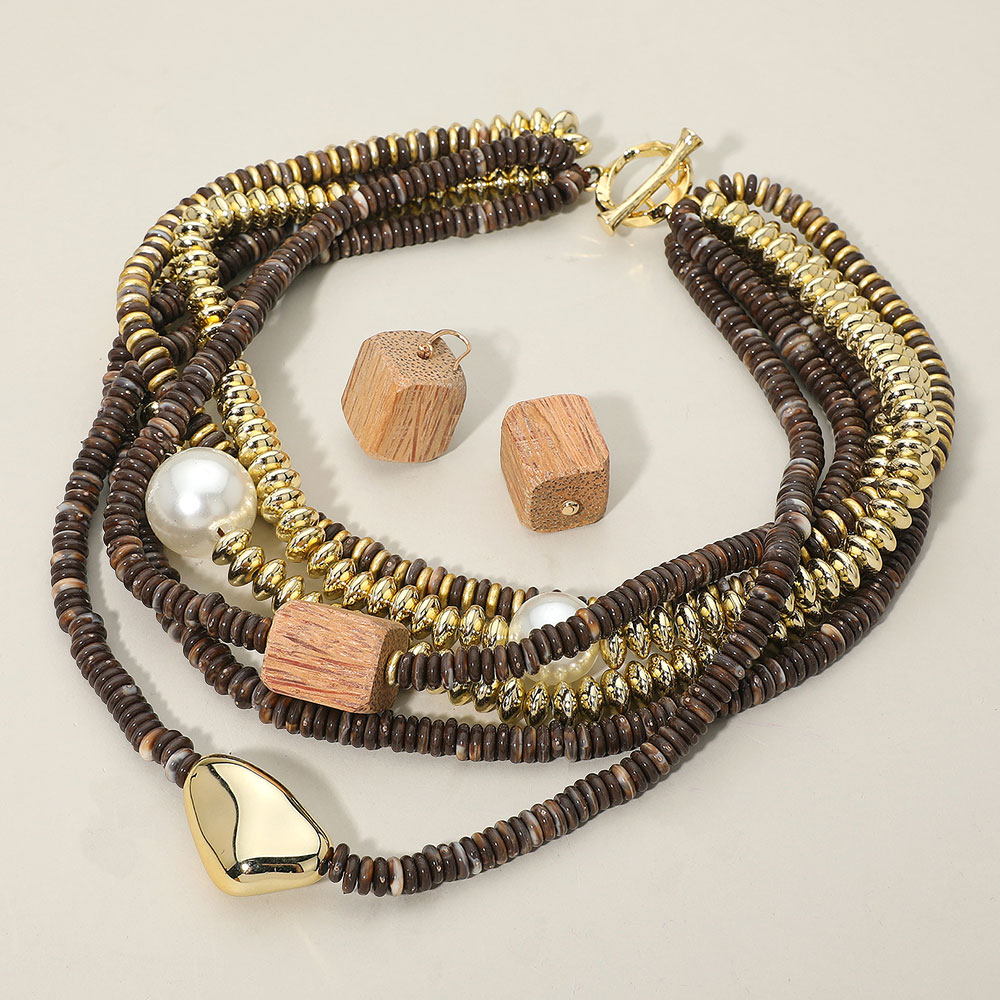 Chunky Pearl Wooden Cube Metal Pebble Accent Multi Disc Beaded Layered Toggle Statement Necklace