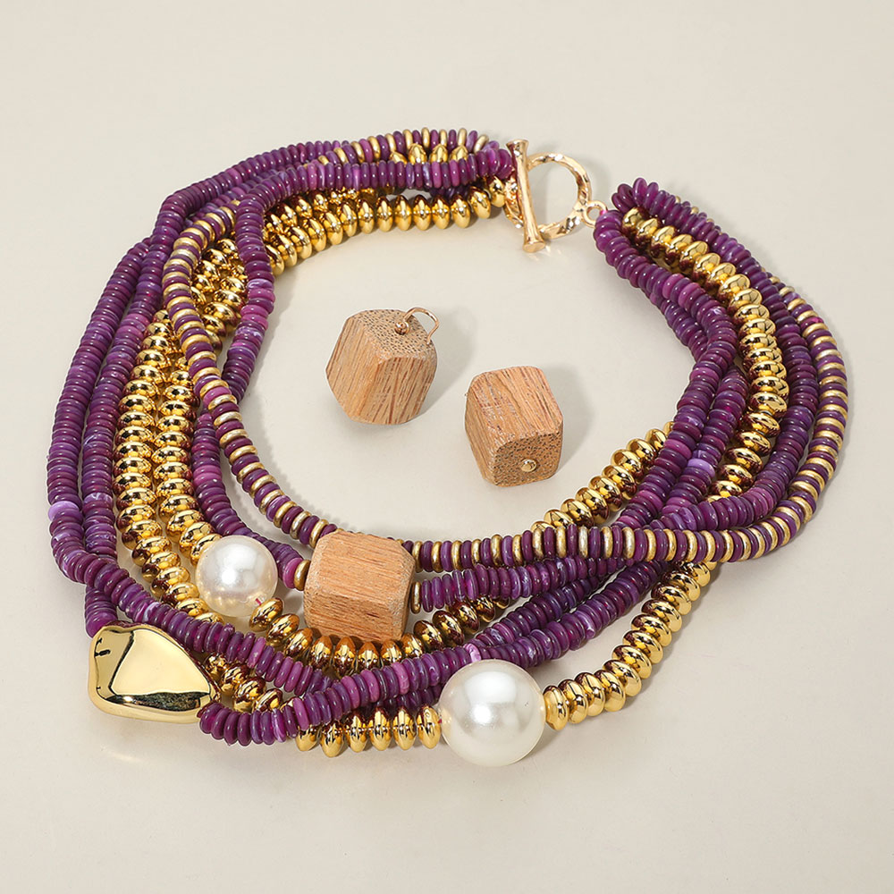 Chunky Pearl Wooden Cube Metal Pebble Accent Multi Disc Beaded Layered Toggle Statement Necklace