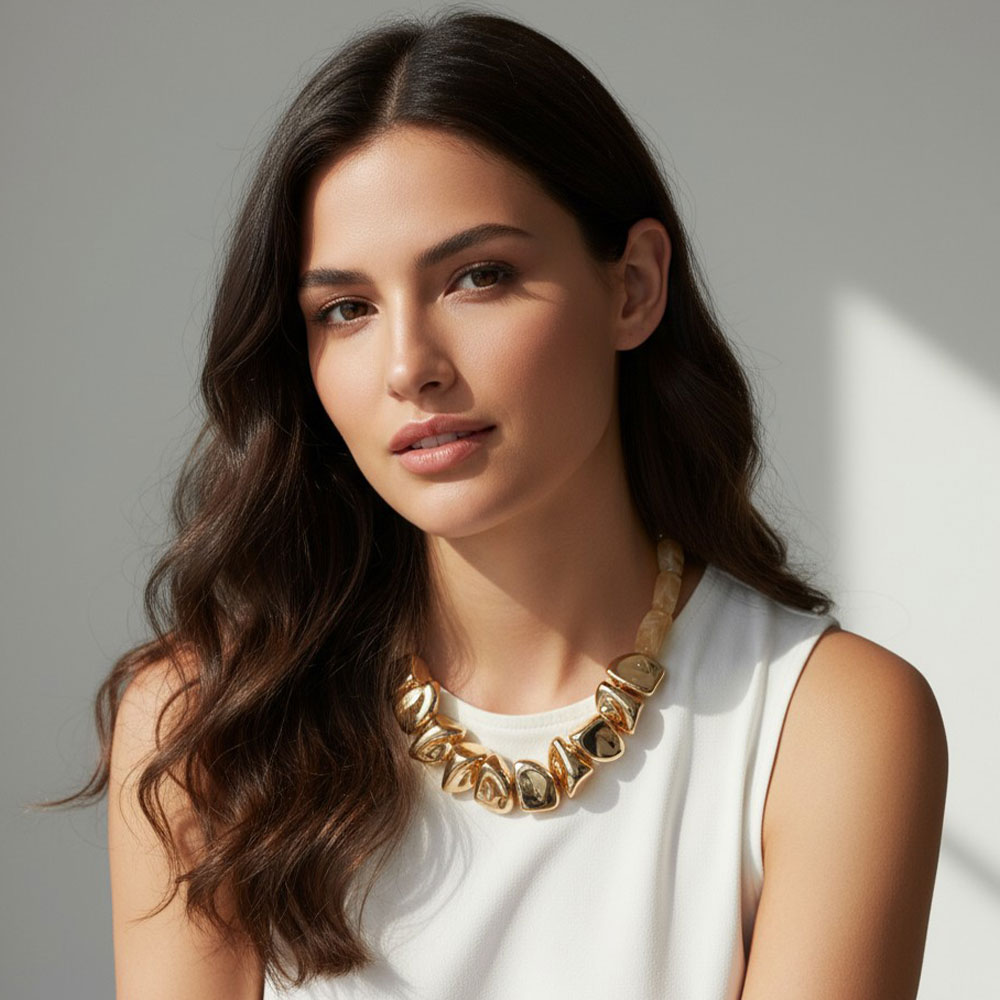 • Bold and modern chunky beaded necklace featuring polished metal accents paired with smooth marbled beads. Designed with an adjustable clasp for comfort, this necklace brings a touch of natural elegance and contemporary style to any jewelry collection.
