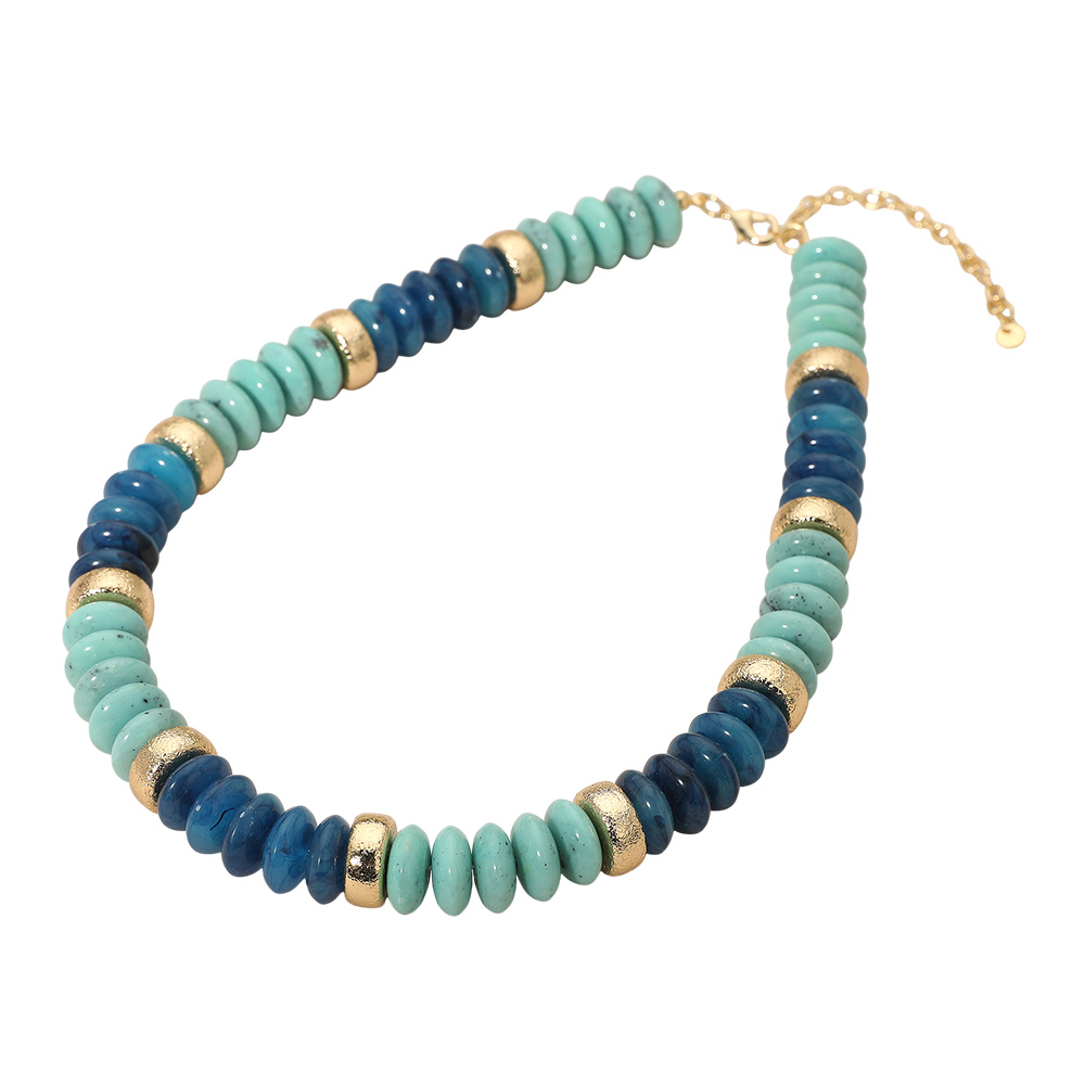 Details • Necklace Size : 17" + 3" L • Decor Size : 0.6" L • Bold and contemporary, this chunky beaded necklace features smooth disc-shaped beads with metallic gold-tone spacers. A versatile statement piece that elevates any outfit with its sleek, modern design. • Lead and Nickel Compliant