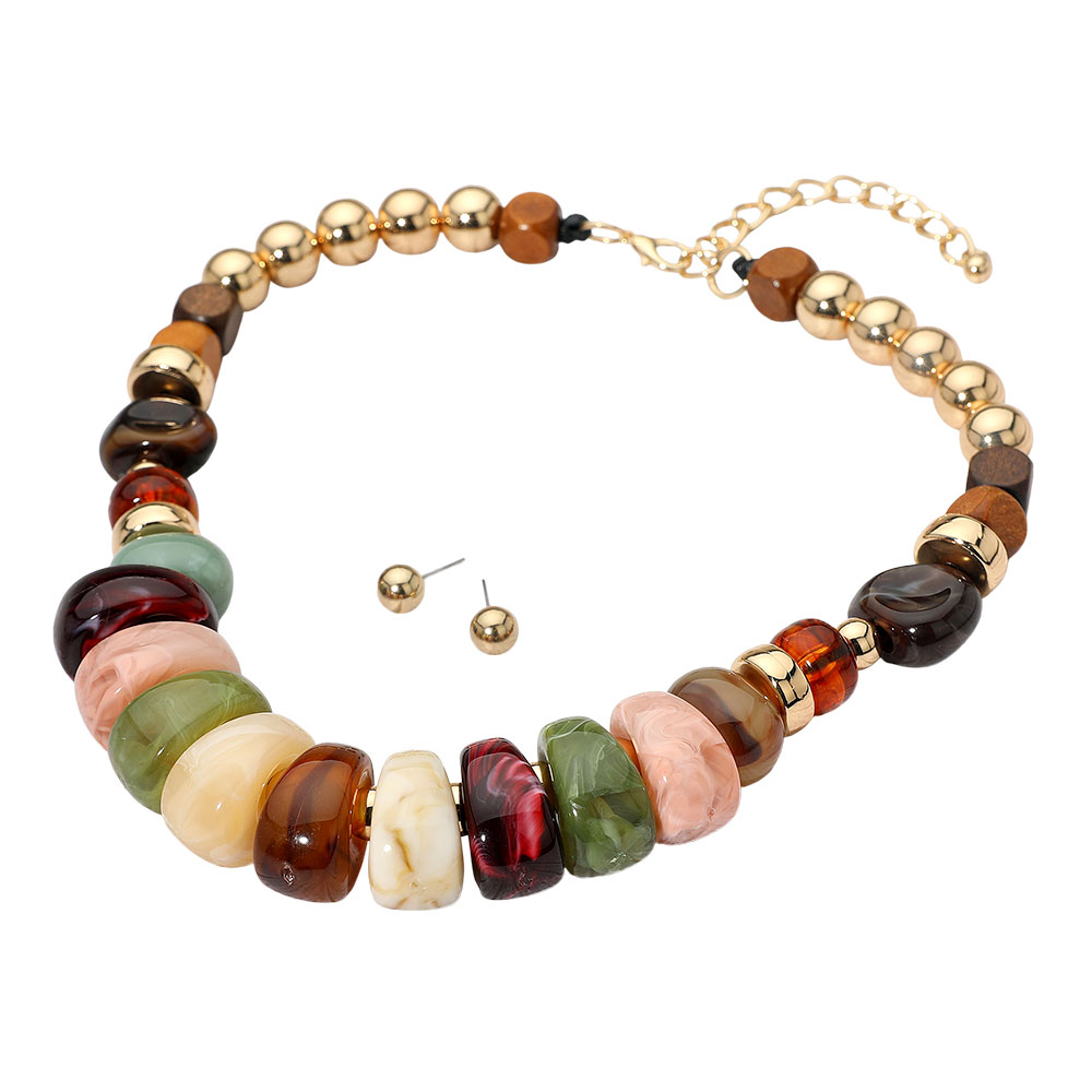 Details • Necklace Size : 17" + 3" L • Decor Size : 1" L • Earrings Size : 0.3" L • Bold chunky beaded necklace paired with classic stud earrings for a polished and stylish look. Designed to make a statement, this coordinated jewelry set adds sophistication to casual and dressy outfits, making it a standout addition to any accessory collection. • Lead and Nickel Compliant