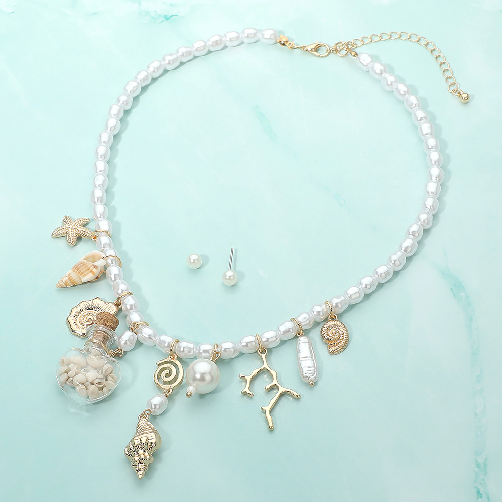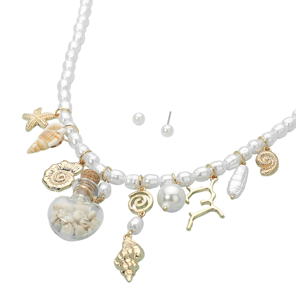 Details • Necklace Size : 16.5" + 3.25" L • Decor Size : 2.3" L • Earrings Size : 0.2" L • Playful charm necklace and stud earring set featuring bead-style accents and assorted coastal-inspired motifs arranged for movement and layered appeal. Designed to add personality to everyday outfits, vacation looks, and casual styling, this set delivers standout charm for boutique accessory collections. • Lead and Nickel Compliant