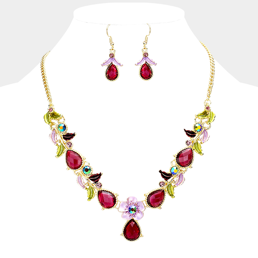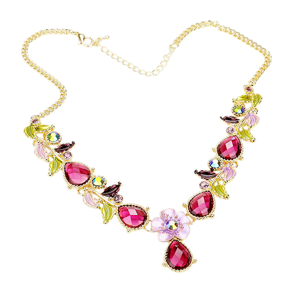 Colored Metal Flower Leaf Teardrop Stone Bib Necklace