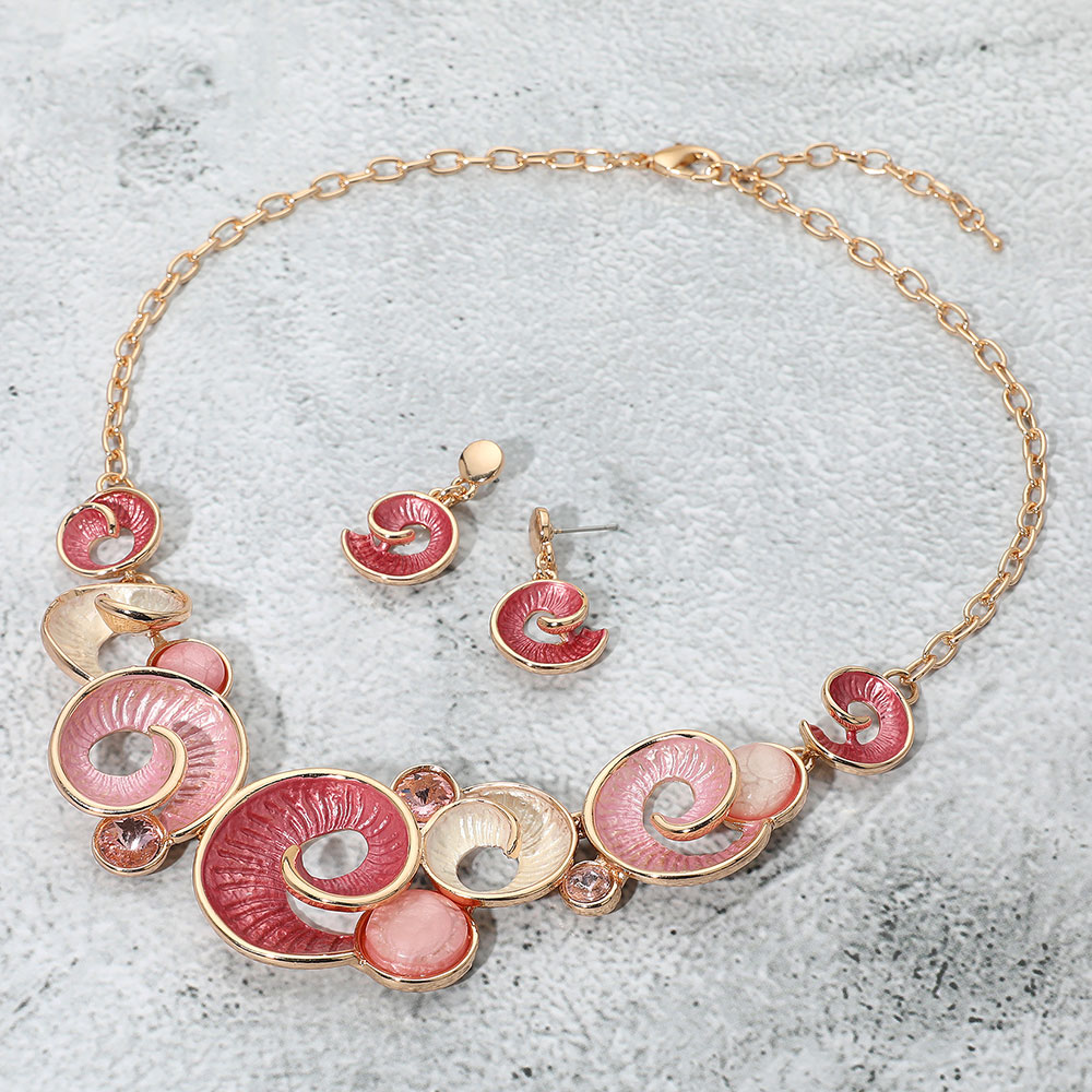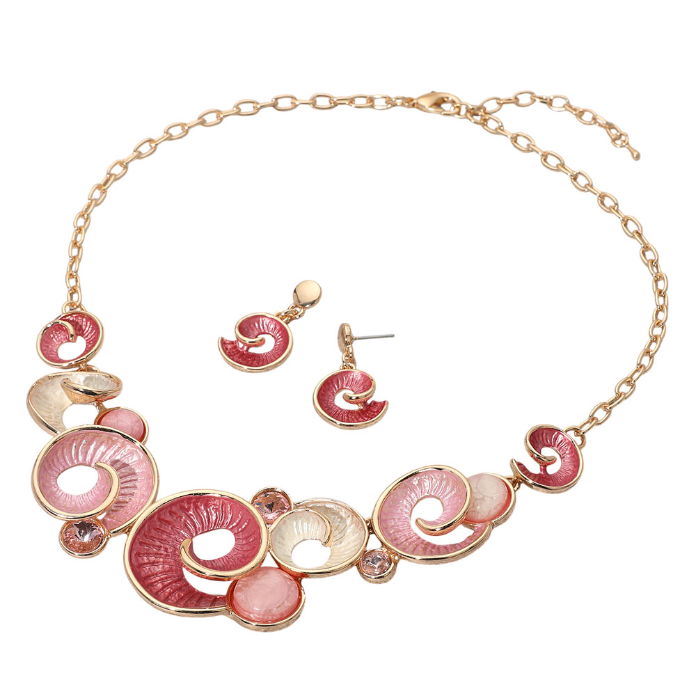 • Bold statement necklace and earring set featuring vibrant swirl designs with gemstone accents. Perfect for adding artistic flair and unique style to both casual and dressy outfits.
