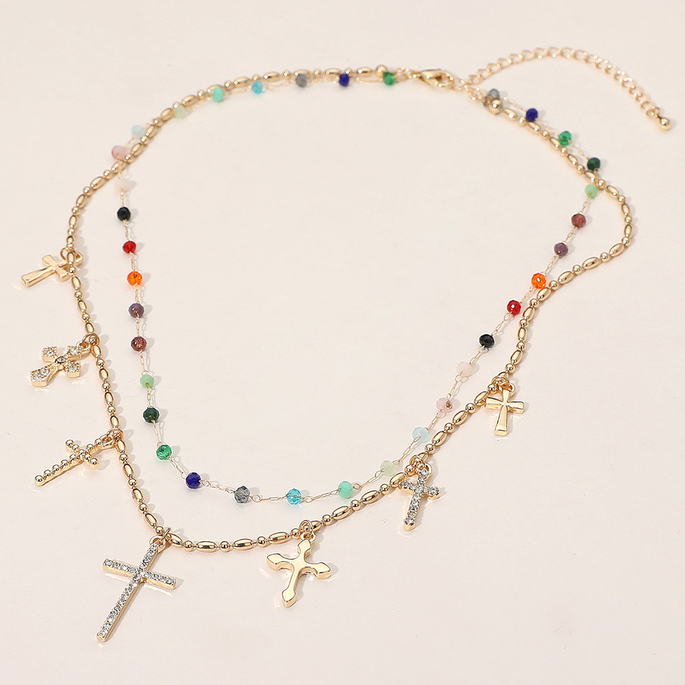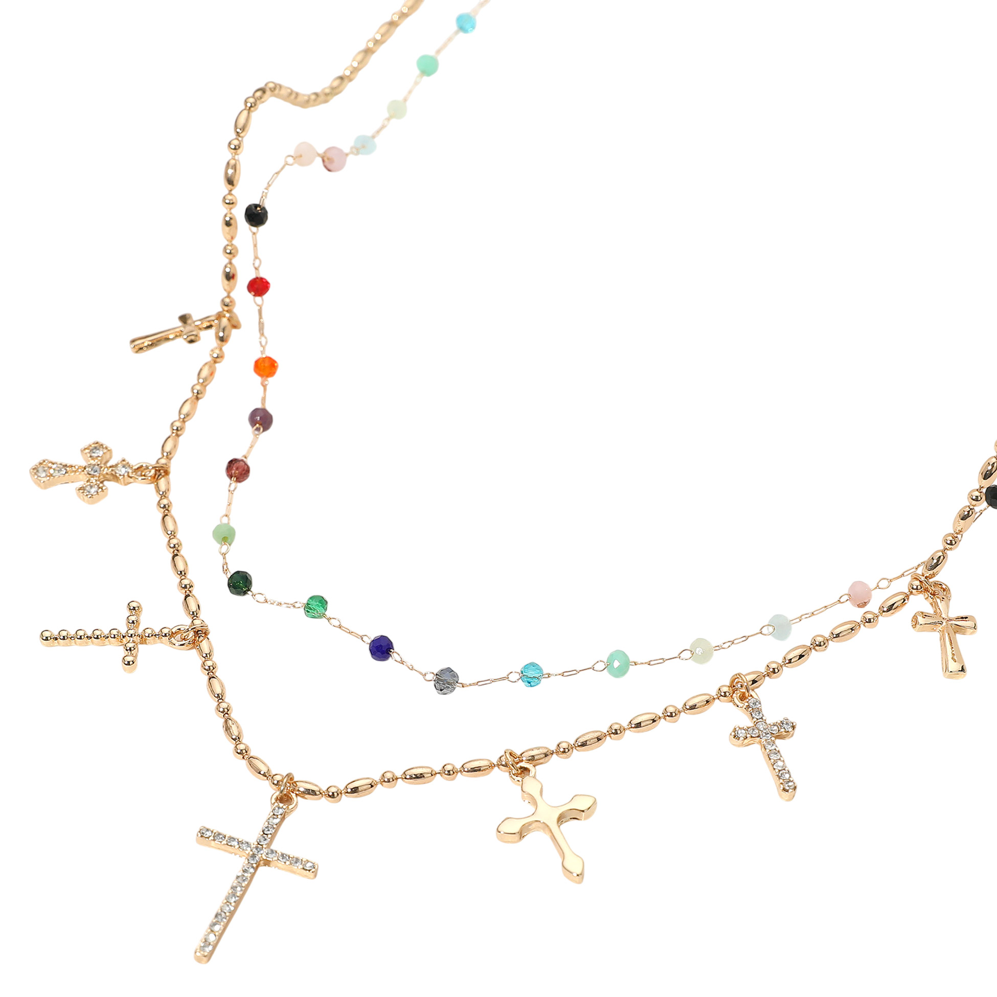 Details • Necklace Size : 14.5" + 3" L • Decor Size : 2" L • This layered charm necklace showcases a refined mix of delicate beads and cross pendants, blending elegance with symbolic design. Its detailed craftsmanship and versatile layered look make it a standout accessory for adding a meaningful yet stylish touch to any outfit. • Lead and Nickel Compliant