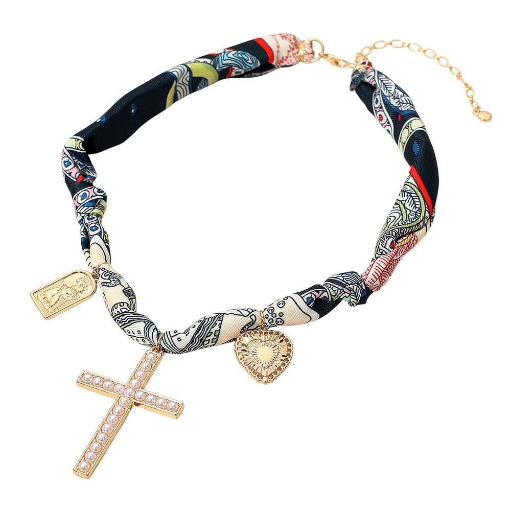 Cross Heart Religious Charm Fabric Scarf Necklace Cross Heart Religious Charm Fabric Scarf Necklace