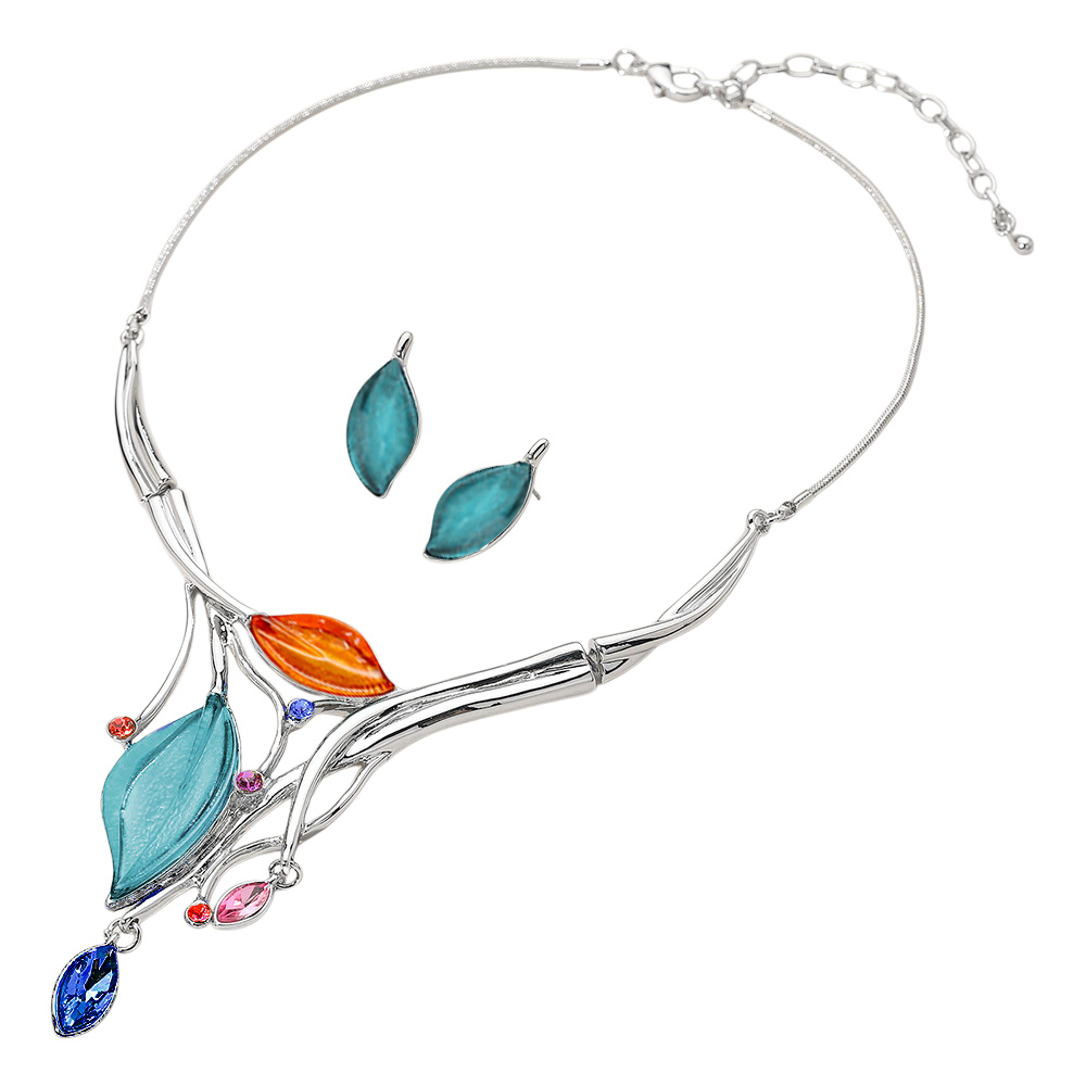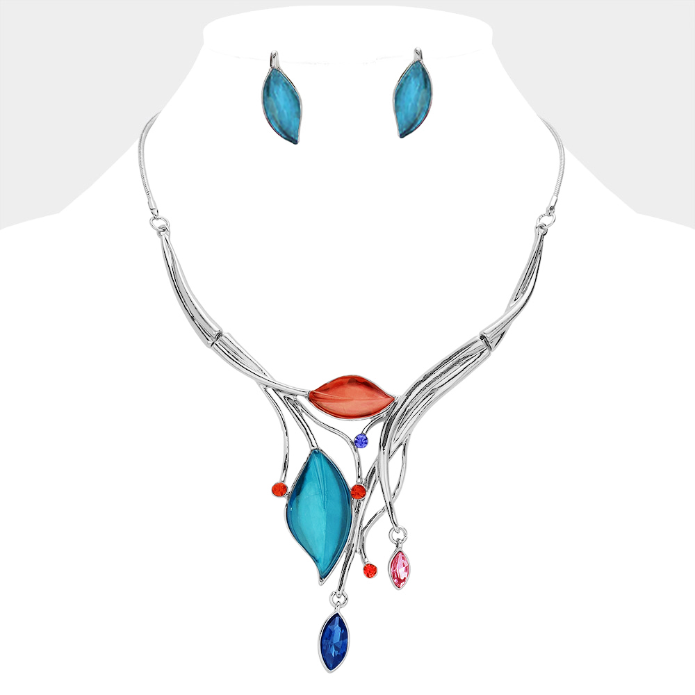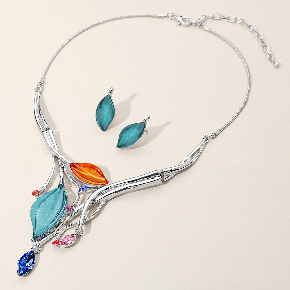 • Elegant leaf pendant necklace with matching earrings featuring sleek metallic accents and delicate leaf shapes. This jewelry set adds a refined and feminine touch, perfect for formal occasions or stylish everyday wear.
