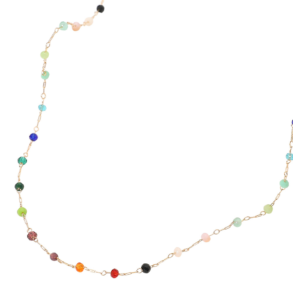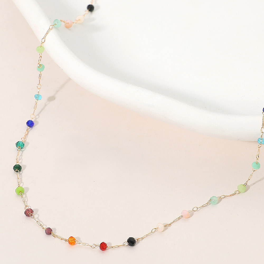 Details • Necklace Size : 14.5" + 3.5" L • Decor Size : 0.1" L • This delicate beaded chain necklace features an elegant arrangement of small, faceted beads along a fine chain. Its lightweight design and refined detailing make it a versatile accessory that adds a subtle pop of style to any look, perfect for layering or wearing on its own. • Brass • Lead and Nickel Compliant