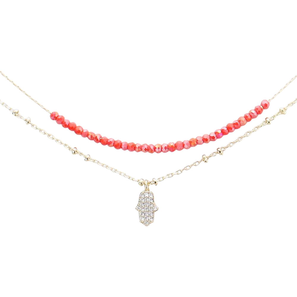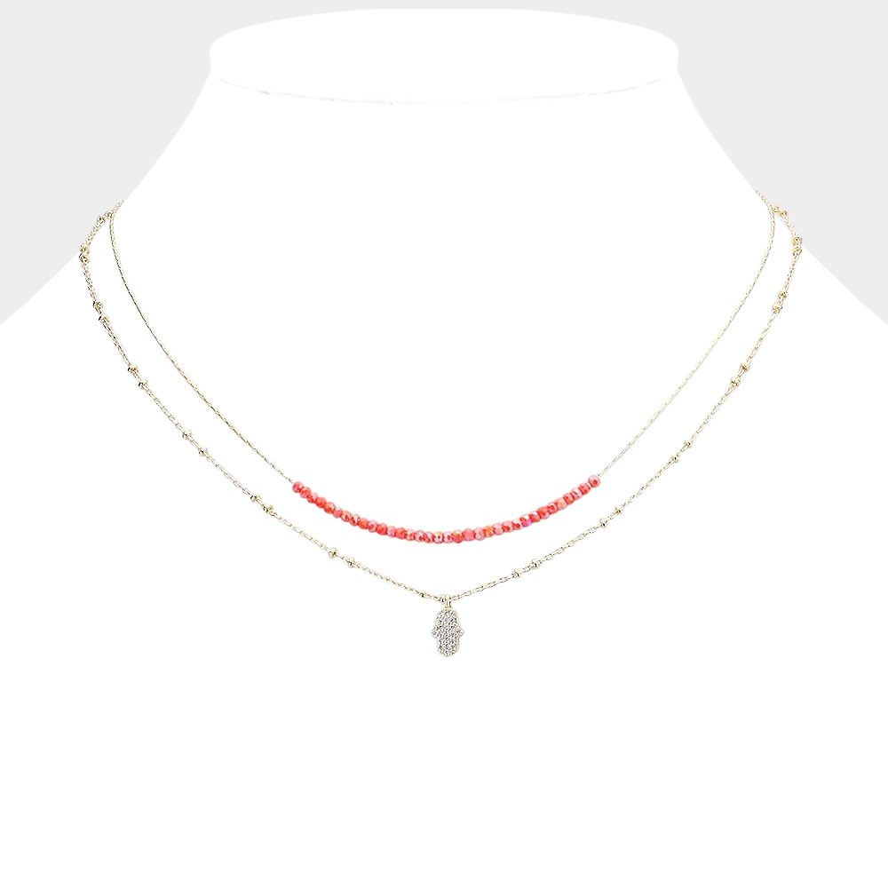 Rhinestone Embellished Hamsa Hand Freshwater Pearl Link Double Layered Necklace