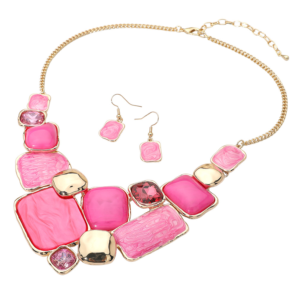 Details • Necklace Size : 18" + 3.5" L • Decor Size : 2.5" L • Earrings Size : 1.4" L • Modern statement necklace and earrings set featuring a mosaic of enamel geometric plate accents framed in metallic trim. The bold mix of smooth and marbled textures adds artistic flair, making it a standout accessory for elegant or contemporary fashion ensembles. • Lead and Nickel Compliant