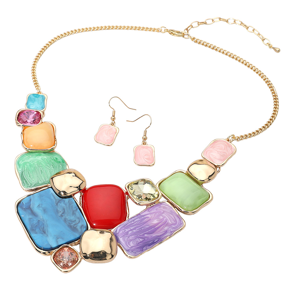 • Modern statement necklace and earrings set featuring a mosaic of enamel geometric plate accents framed in metallic trim. The bold mix of smooth and marbled textures adds artistic flair, making it a standout accessory for elegant or contemporary fashion ensembles.