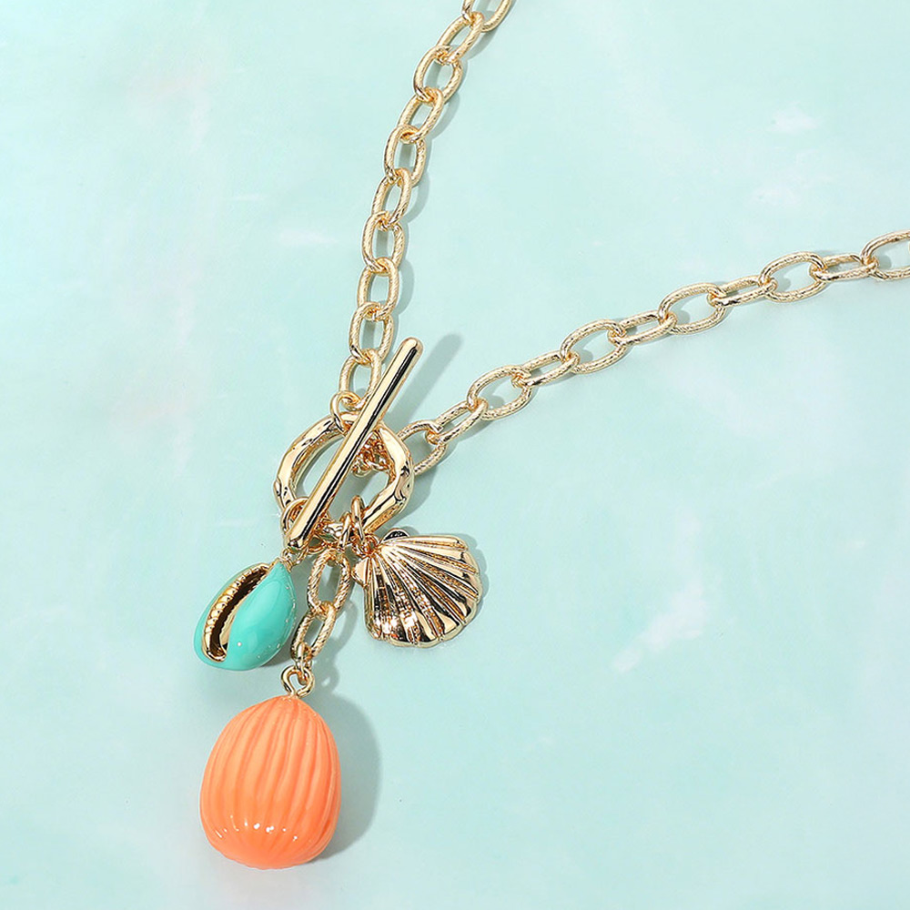 Details • Necklace Size : 16.5" + 3.5" L • Pendant Size : 2.3" L • Gold chain necklace with toggle clasp, featuring tropical-style charms: textured shells and colorful beads. A playful and vibrant accessory ideal for beach days or summer looks. • Lead and Nickel Compliant