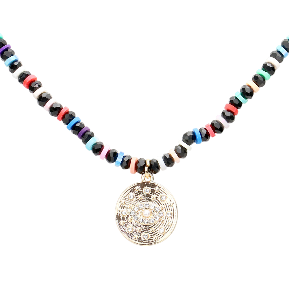 Evil Eye Accented Rhinestone Embellished Round Pendant Beaded Necklace