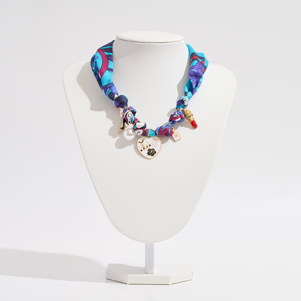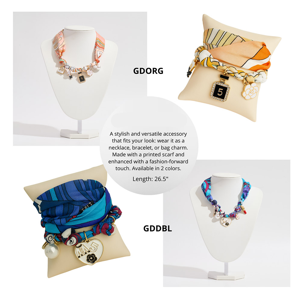 • A chic scarf accessory designed to be worn as a necklace, bracelet, or bag charm. Featuring a printed scarf with stylish fashion-inspired charms, it adds a versatile and modern touch to your look. Available in 2 unique designs for standout style.