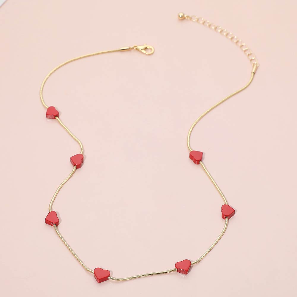 Details • Necklace Size : 16" + 2.25" L • Decor Size : 0.25" L • This heart station necklace features evenly spaced heart accents along a smooth, flexible chain for a balanced and feminine look. Designed for easy layering or standalone wear, it adds charm to everyday outfits, special occasions, and gift assortments, making it a versatile choice for boutique jewelry collections. • Lead and Nickel Compliant