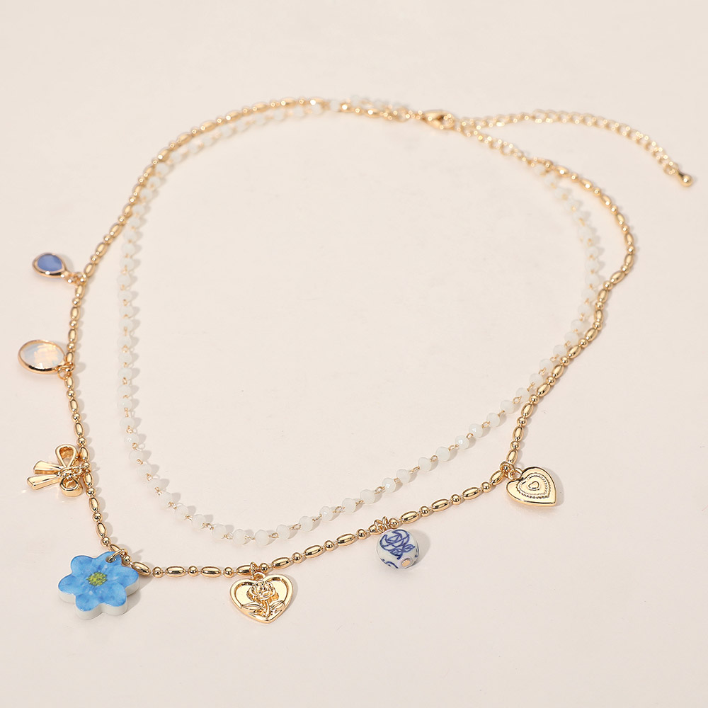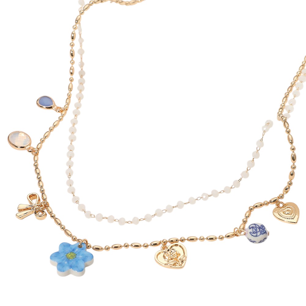 Details • Necklace Size : 14.5" + 3.5" L • Decor Size : 1.75" L • This layered beaded necklace combines elegant charm accents with delicate detailing for a whimsical and feminine touch. Featuring floral and heart pendants, it adds playful sophistication to any outfit, making it a perfect accessory for casual, romantic, or chic styles. • Lead and Nickel Compliant