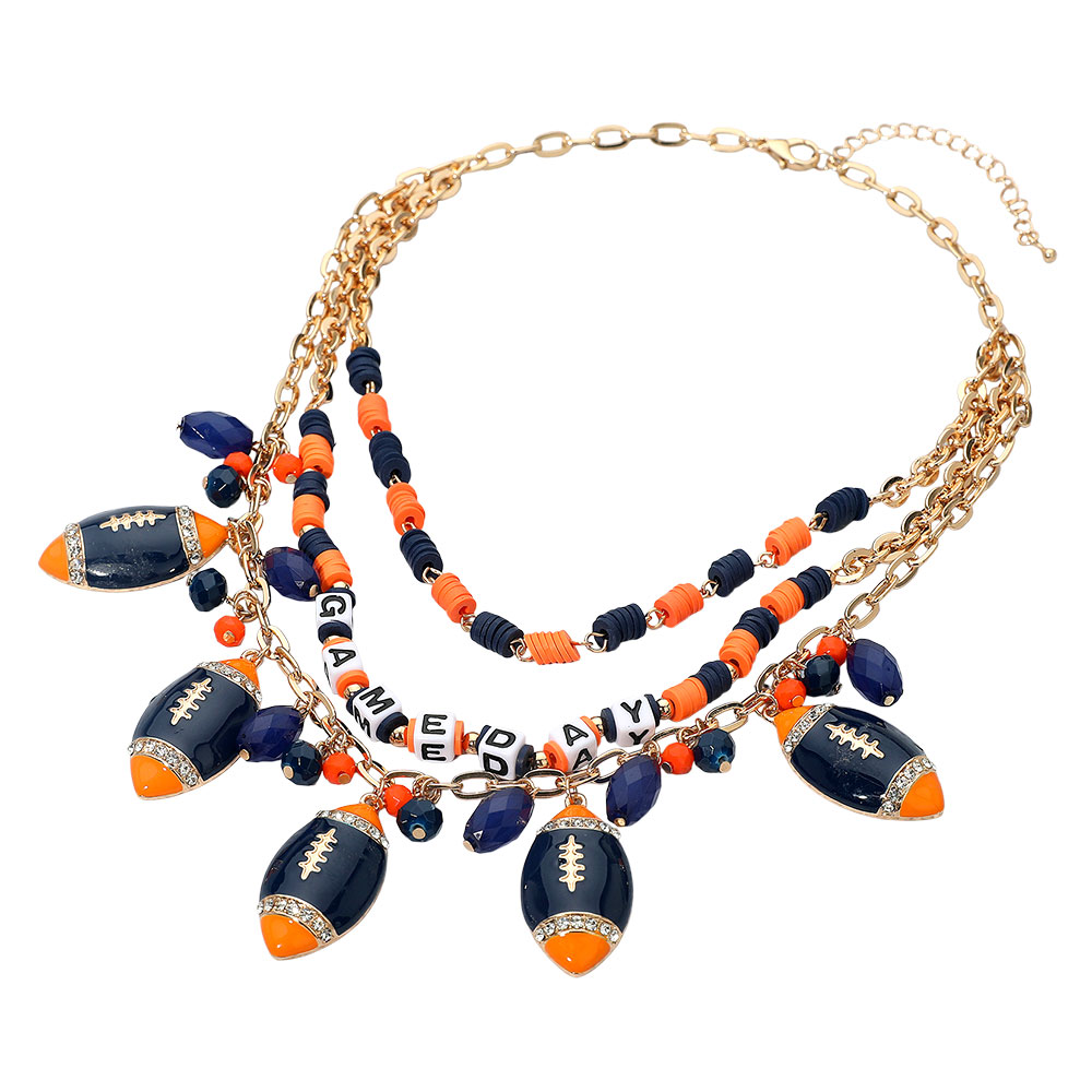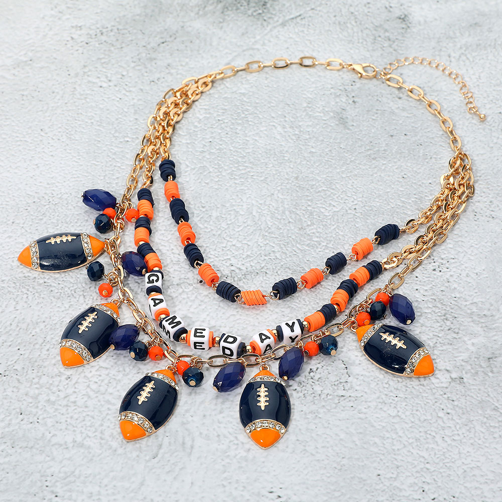 • Layered necklace featuring football charms, gameday letter beads, and playful accents. A spirited accessory to show team pride, add energy to gameday looks, and complete fan outfits with fun layered style.
