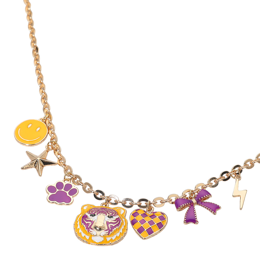 • Necklace featuring playful gameday charms including team mascot animal, paw, heart, bow, star, lightning bolt, and smiley face. A spirited accessory to show team pride, add personality, and complete sporty gameday outfits.