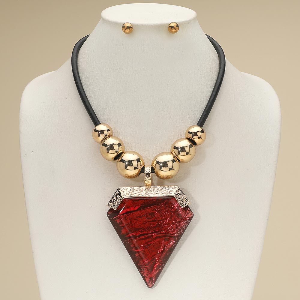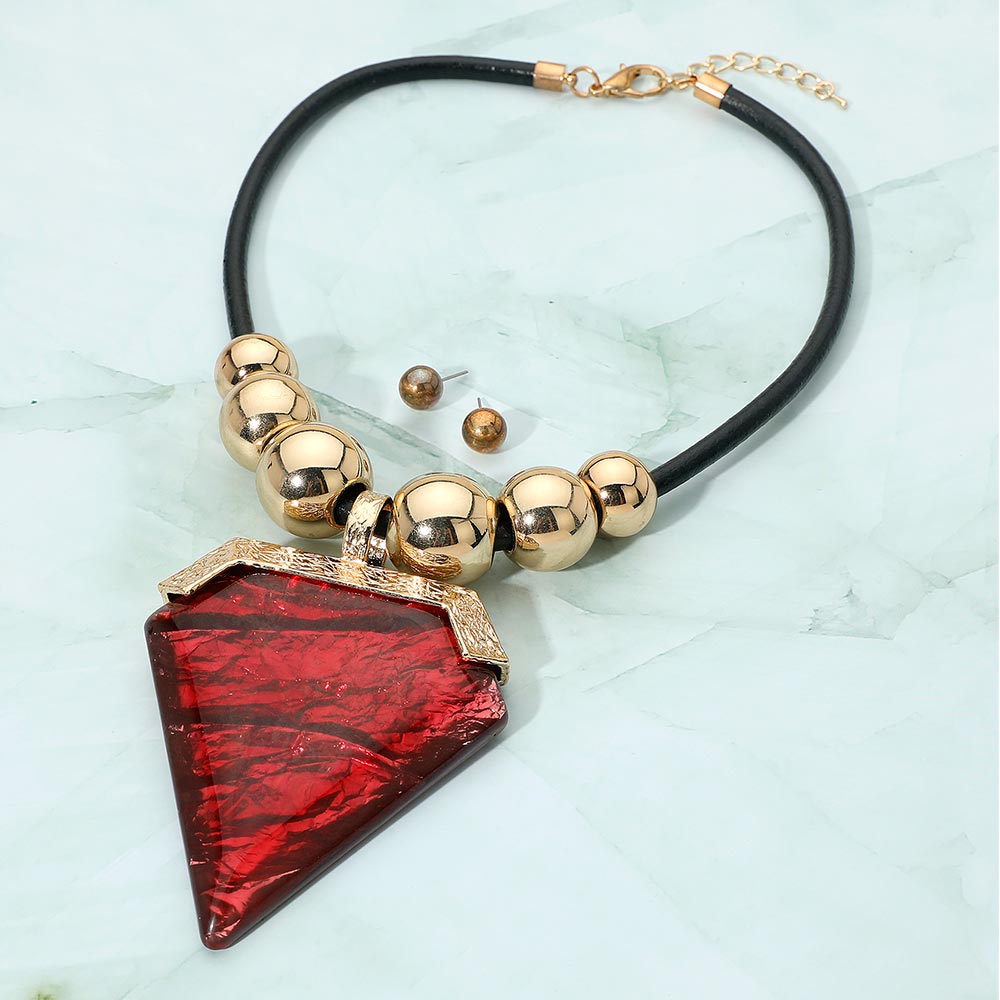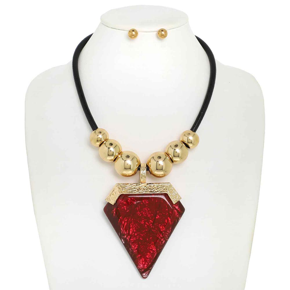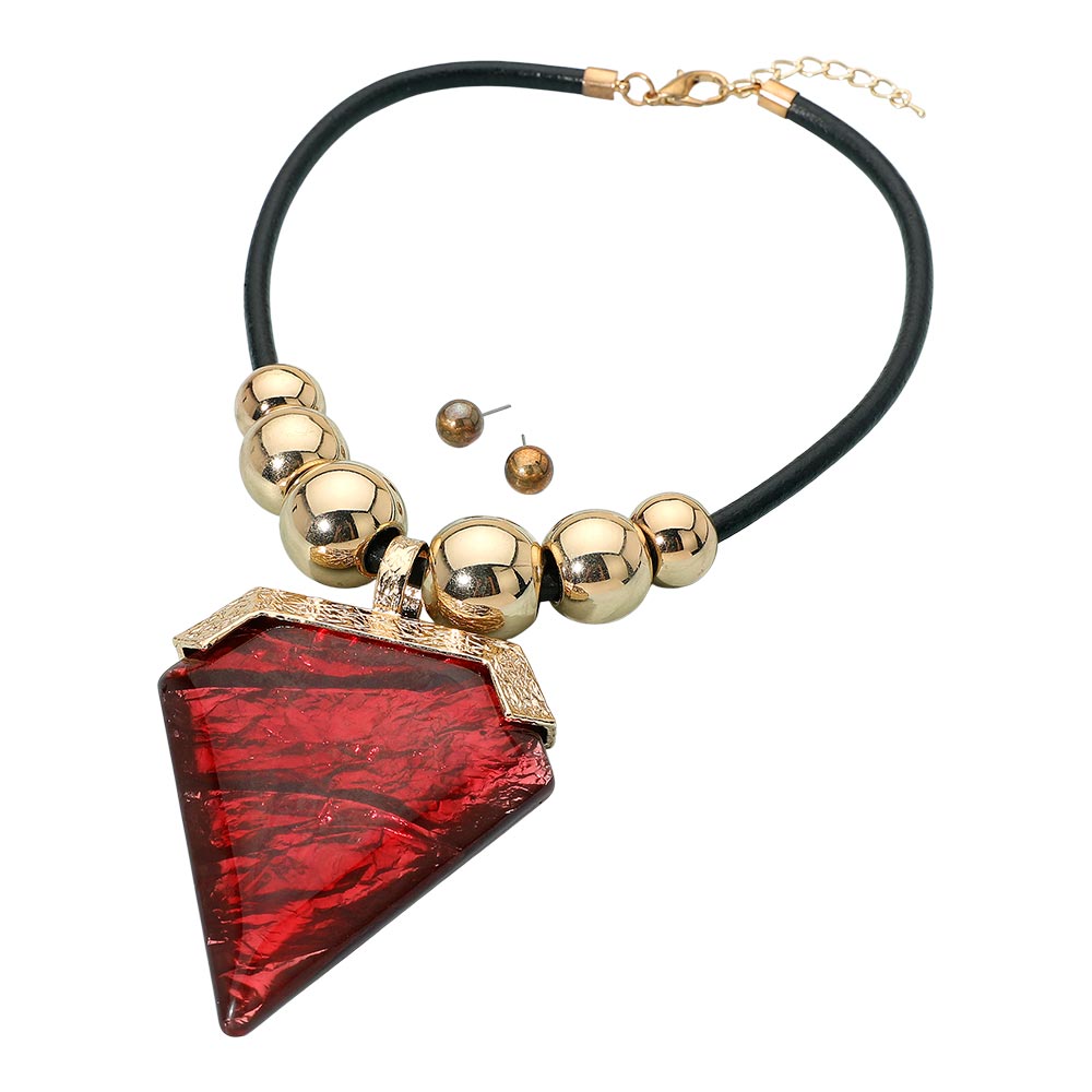 • Turn heads with the Geometric Statement Necklace Set, featuring a striking triangular pendant and polished gold accents. Paired with matching stud earrings, this bold design adds a touch of modern elegance, perfect for elevating evening wear or enhancing any standout look.