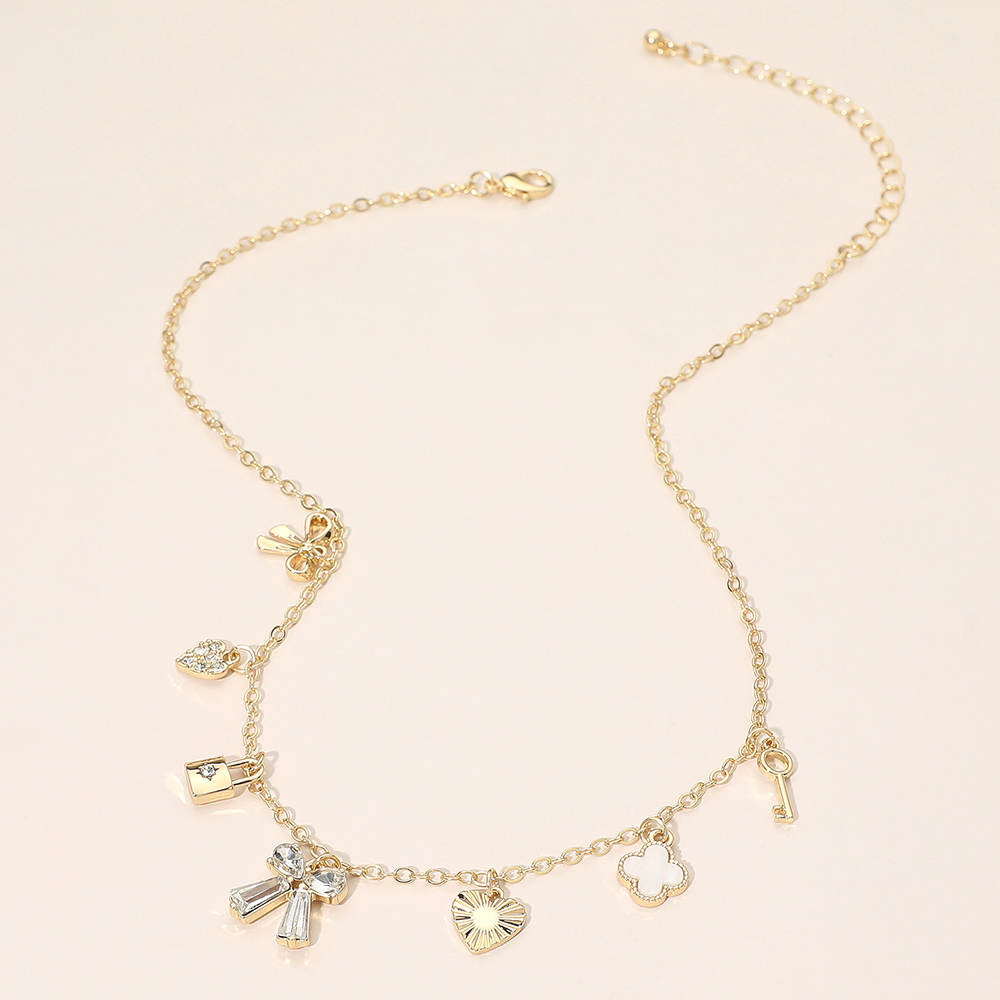 Details • Necklace Size : 16" + 3" L • Decor Size : 0.6" L • This charm necklace features a playful mix of heart, bow, key, lock, and symbolic accents arranged along a delicate chain for a stylish layered look. Designed to add personality and charm to everyday outfits, it’s perfect for boutique displays, gifting, or trend driven collections focused on romance, luck, and statement accessories. • Lead and Nickel Compliant • Gold Dipped