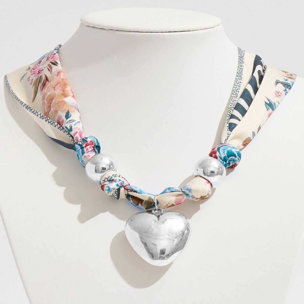 Details • Size : 30" L • Charm Size : 1.75" L • Print may vary • A stylish accessory designed to be worn as a necklace, bracelet, or bag charm. Crafted with a printed scarf and accented with spheres and a bold heart pendant, it adds elegance and versatility. Available in gold or silver for chic everyday or statement styling. • Brass • Gold Dipped • Hypoallergenic • Lead and Nickel Compliant • Made In Korea