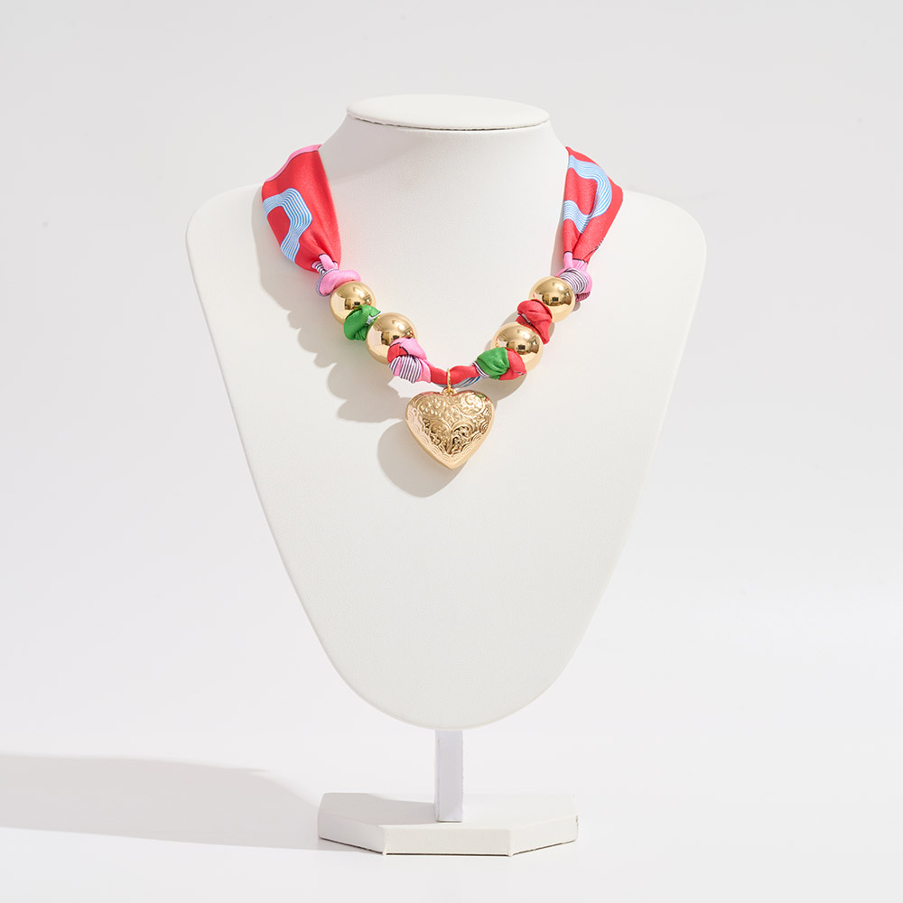 • Versatile scarf accessory styled as a necklace, bracelet, or bag charm. Features a printed scarf with two bold spheres and a textured heart pendant for elegance and charm. Available in 4 unique designs to suit every look, this multifunctional piece adds sophistication.