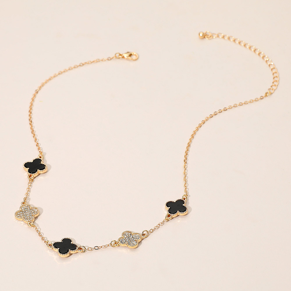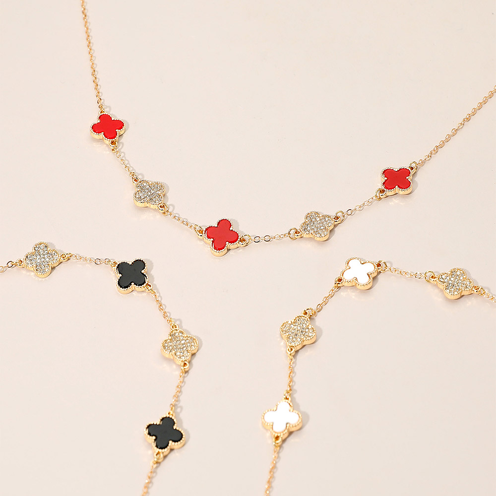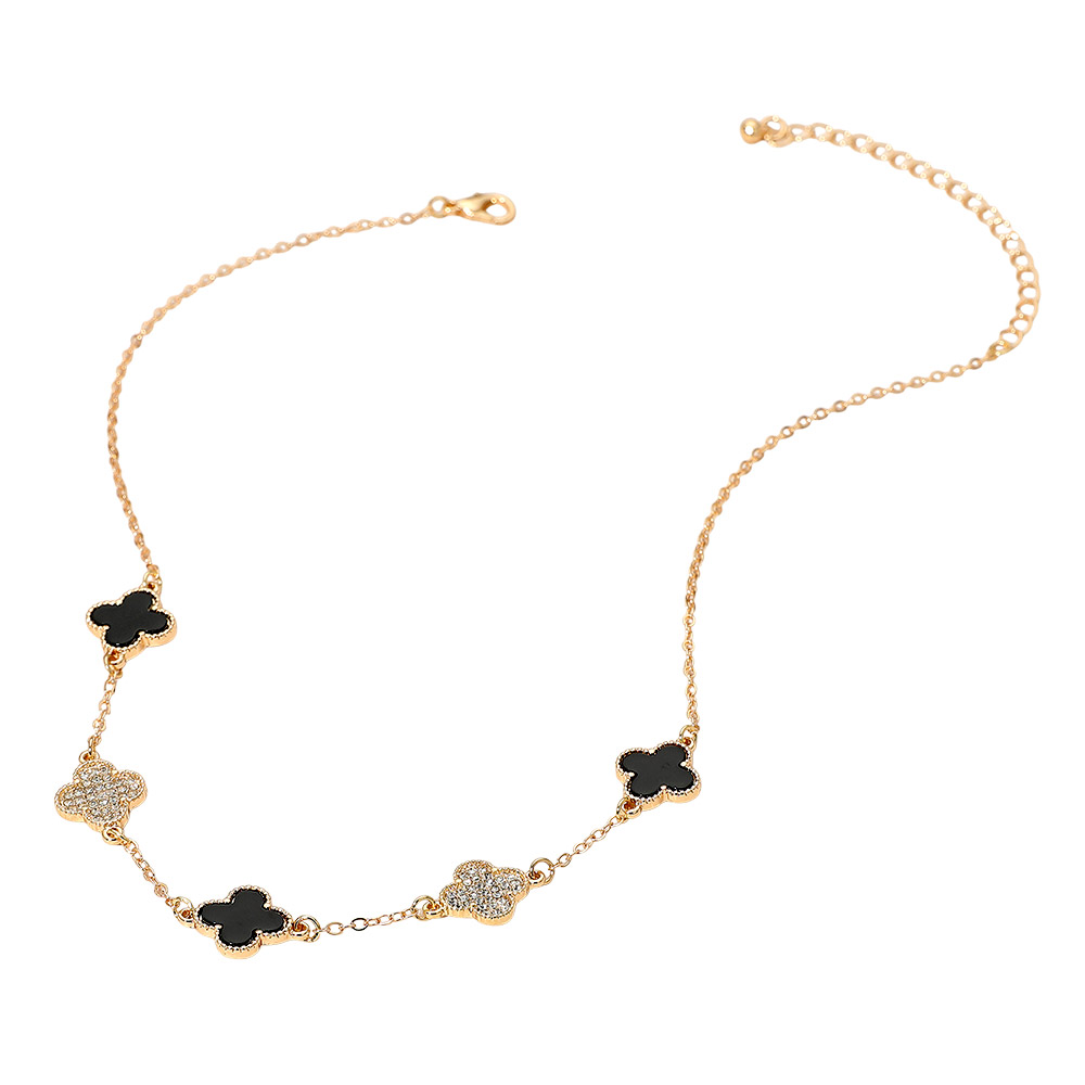 Details • Necklace Size : 15.5" + 3" L • Decor Size : 0.5" L • Add refined elegance to any outfit with this clover charm necklace featuring alternating enamel and crystal-accented charms. Designed with a sleek chain and timeless motif, it’s a versatile piece that complements both casual and dressy looks with effortless sophistication. • Gold Dipped • Lead and Nickel Compliant