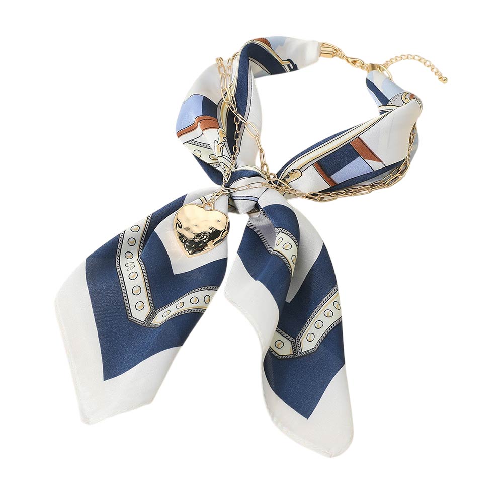 Details • Necklace Size : 15" + 3.5" L • Decor Size : 8" L • Pattern May Vary • This chain detail scarf necklace blends a soft draped scarf with a linked accent and heart charm for a refined statement look. Designed to wear as a necklace, it adds effortless polish to casual and dressy outfits, making it a versatile accessory for everyday styling and elevated fashion collections. • Lead and Nickel Compliant
