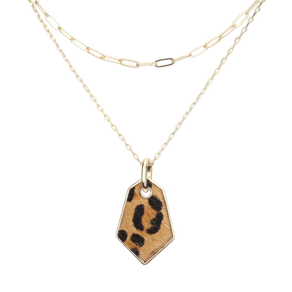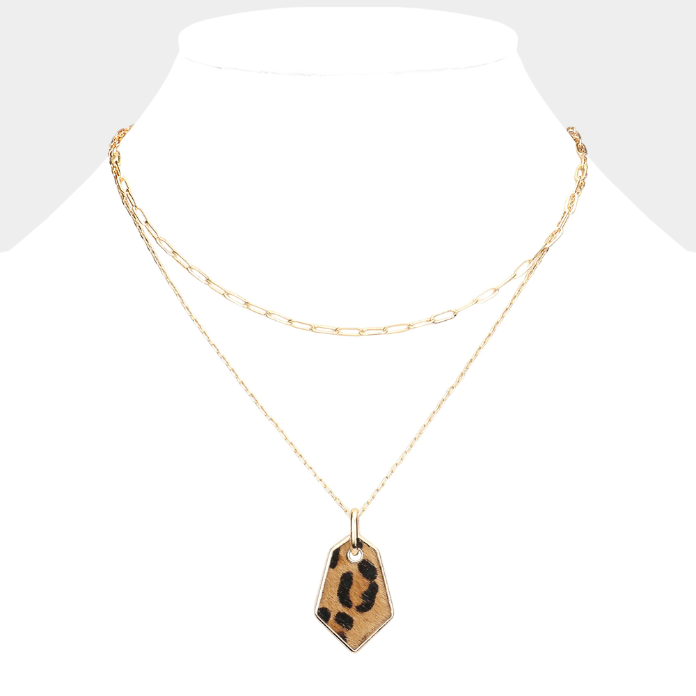 Cheetah Patterned Genuine Leather Angled Pendant Double Layered Necklace