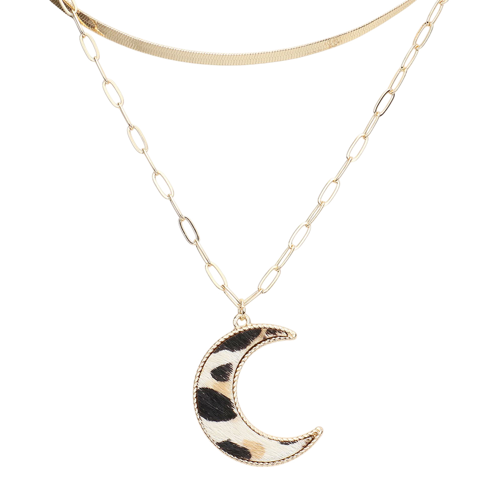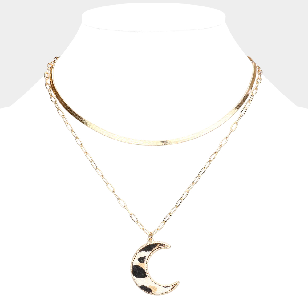 Leopard Patterned Genuine Leather Crescent Moon Pendant Double Layered Necklace