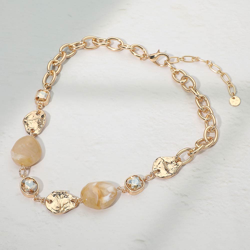 Marbled Resin Pebble Hammered Metal Plate Stone Cluster Link Necklace