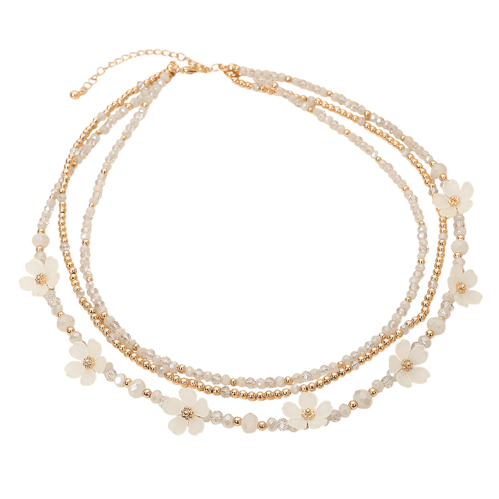 • Embrace elegance with this layered floral beaded necklace. Featuring delicate multi-strand design with shimmering beads and petite flower accents, it adds a playful yet refined touch to any ensemble—perfect for both casual charm and special occasions.