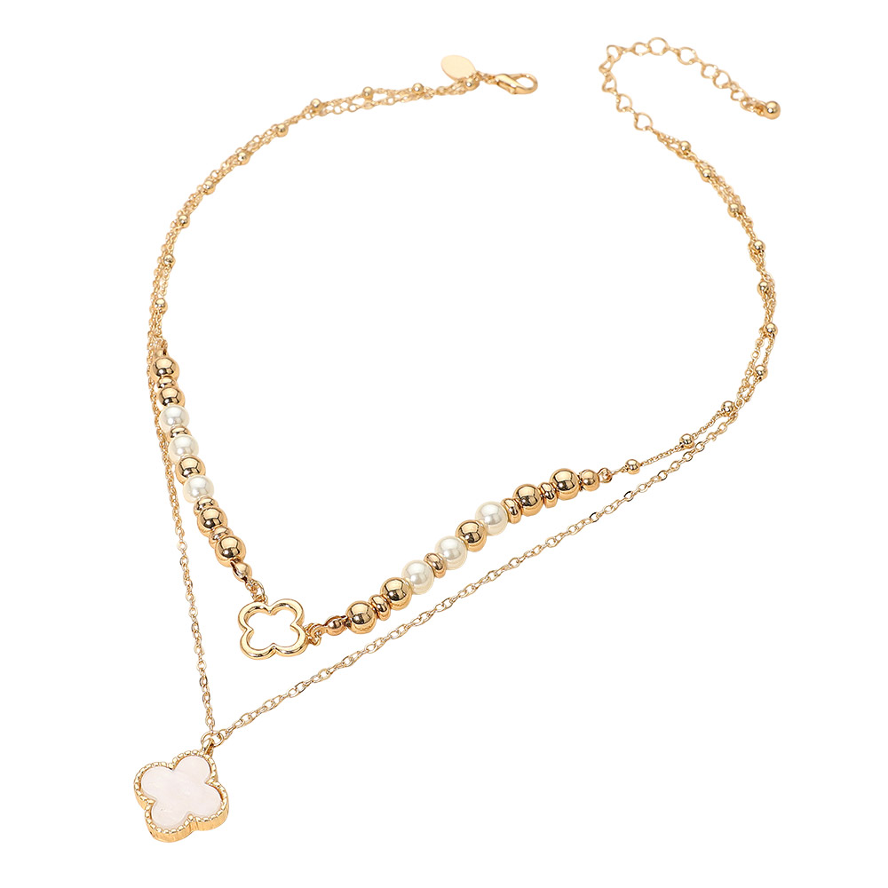 Details • Necklace Size : 16" + 3" L • Decor Size : 3" L • Pendant Size : 0.7" X 0.7" • Elegant layered necklace featuring beaded details and dual quatrefoil pendants for a refined, on-trend look. Designed to style beautifully alone or with other chains, it adds subtle charm to everyday outfits, evening ensembles, or thoughtful gift selections for any occasion. • Lead and Nickel Compliant