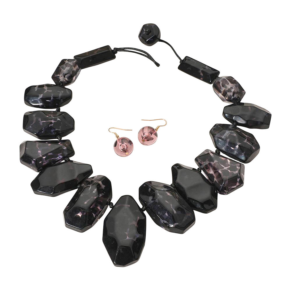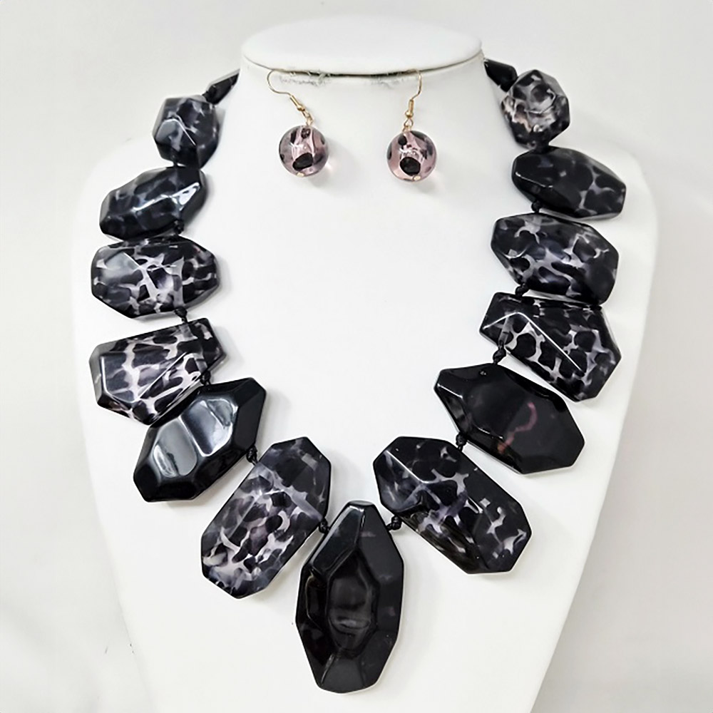 Details • Necklace Size : 21.5" + 2.5" L • Decor Size : 2.5" L • Earrings Size : 1.75" L • Bold faceted necklace and matching earrings set with oversized geometric beads. This eye-catching duo is perfect for adding drama to evening looks or elevating any outfit with striking, sculptural style. • Lead and Nickel Compliant