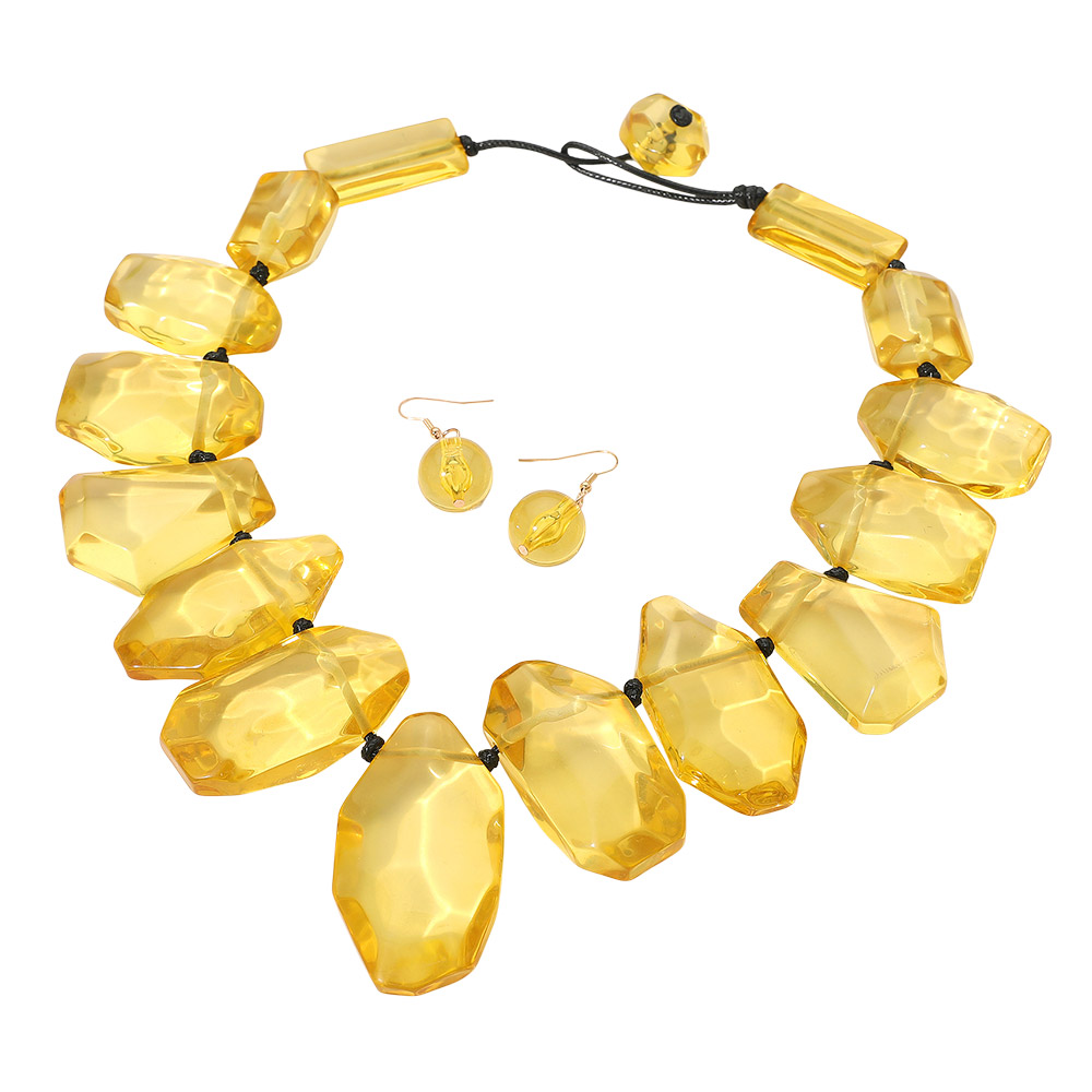 Details • Necklace Size : 21.5" + 2.5" L • Decor Size : 2.5" L • Earrings Size : 1.75" L • Bold faceted necklace and matching earrings set with oversized geometric beads. This eye-catching duo is perfect for adding drama to evening looks or elevating any outfit with striking, sculptural style. • Lead and Nickel Compliant